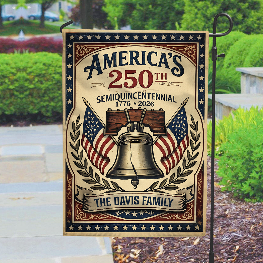 Celebrate America's historic 250th anniversary with this custom garden flag featuring your family name. Perfect for patriotic displays, this semiquincentennial design combines timeless American pride with personalized elegance. Crafted for outdoor durability, it adds a meaningful touch to your home's entrance or garden. Honor this momentous milestone while showcasing your family identity. An ideal keepsake for the nation's golden jubilee year.