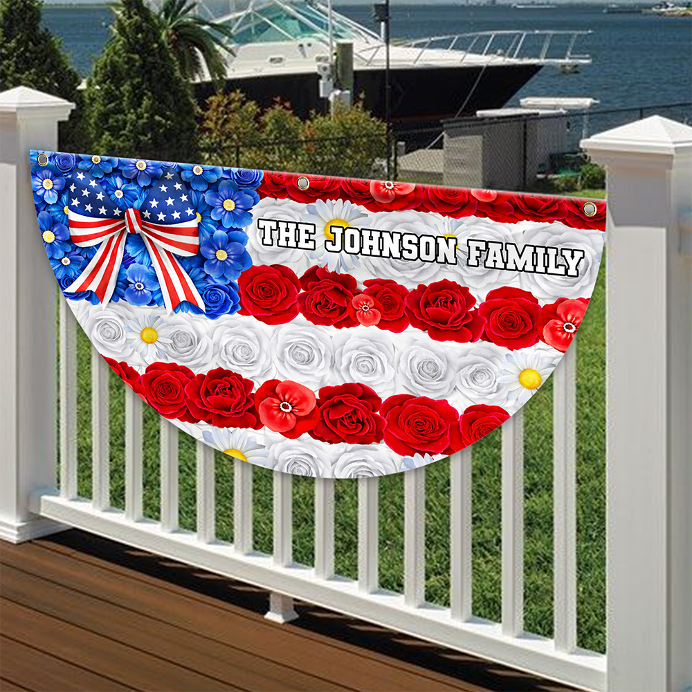 Honor your heritage with this stunning custom family name flag, beautifully blending red, white, and blue florals with patriotic pride. Perfect for Independence Day celebrations or year-round display, this non-pleated fan flag transforms your space into a tribute to both family and country. The elegant floral design adds sophistication while maintaining bold American spirit. Durable and eye-catching, it's an ideal way to showcase your family name with timeless patriotic elegance.