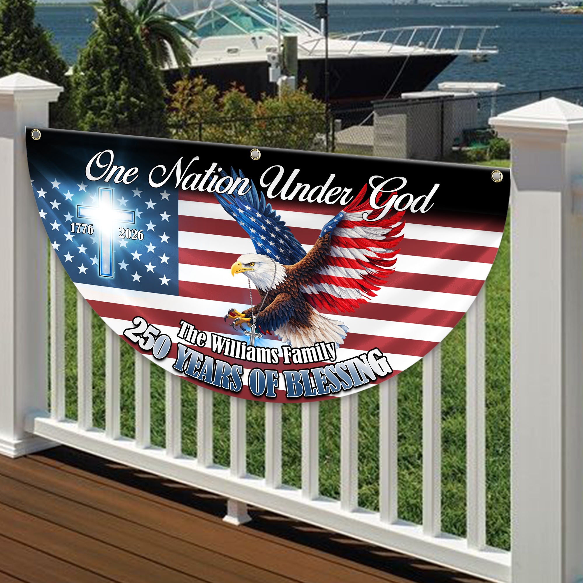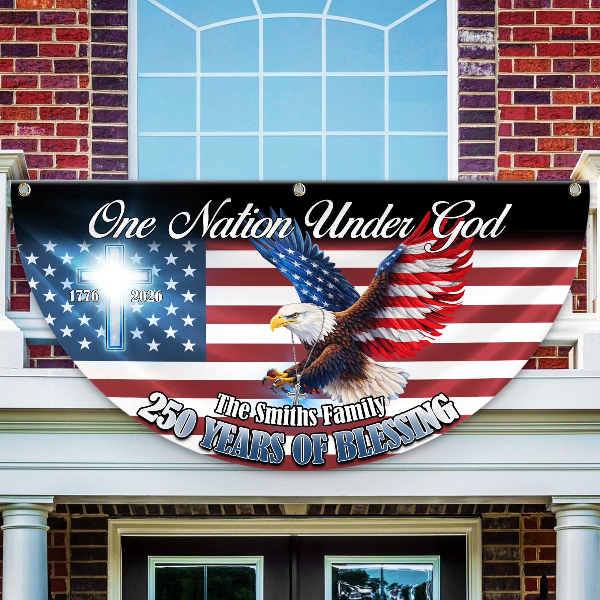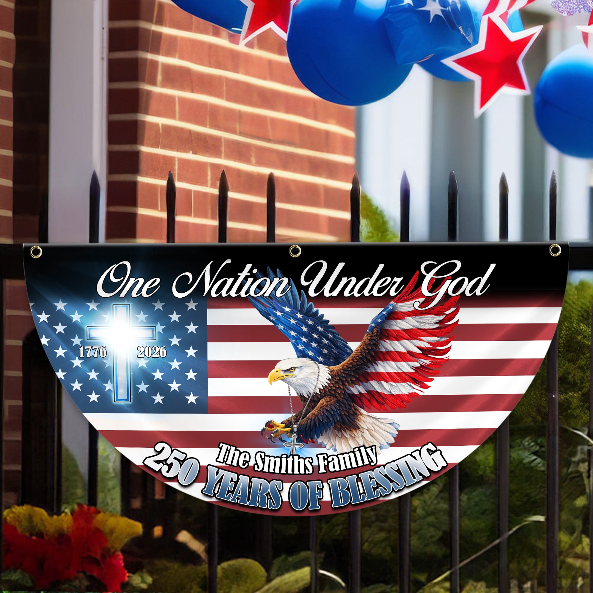 Celebrate America's legacy with this striking personalized eagle fan flag, commemorating 250 years of freedom from 1776 to 2026. Featuring a bold, non-pleated design that catches the breeze beautifully, this flag model makes a powerful patriotic statement for your home or garden. Perfect as a meaningful gift for history enthusiasts, veterans, or anyone who takes pride in American heritage. The customizable personalization option lets you add a special touch that transforms it from decoration into a treasured keepsake. Display your patriotic spirit with timeless elegance and enduring quality.