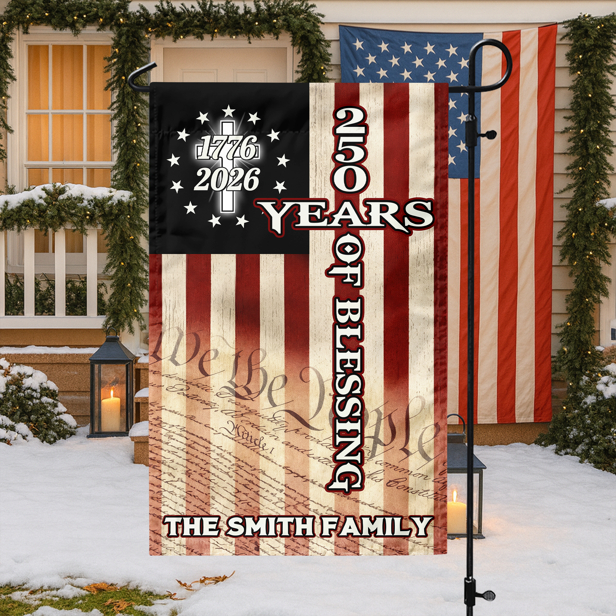 Celebrate your family's enduring legacy with this custom garden flag honoring 250 years of blessings. Personalize it with your family name to create a meaningful display that welcomes guests and reflects your heritage. Crafted for durability, this flag withstands the elements while adding warmth and character to your outdoor space. Perfect for family reunions, anniversaries, or simply showcasing the values that define your lineage. Let your home tell your family's story with pride and distinction.