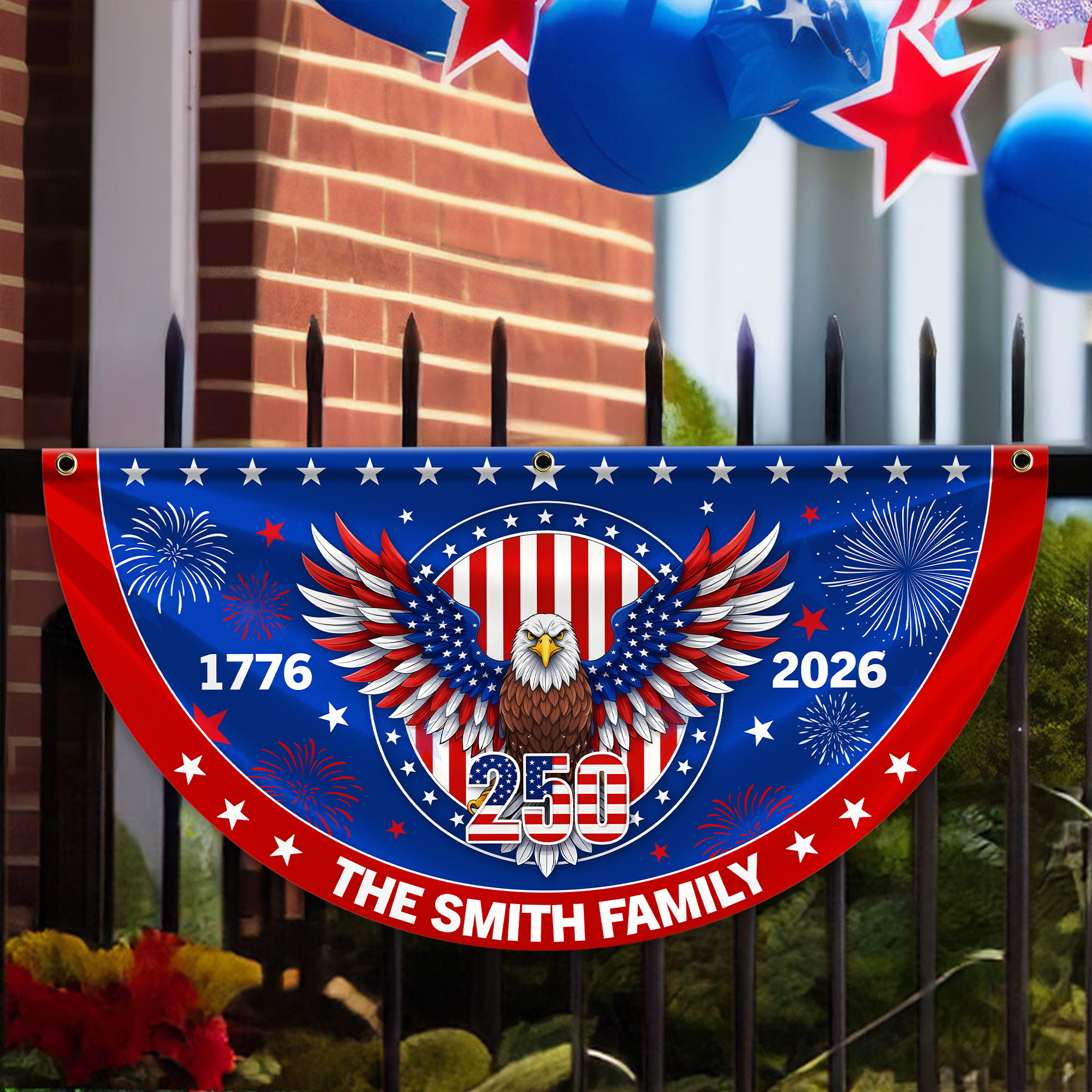 Celebrate America's historic milestone with this striking 250th Birthday Eagle Fan Flag, commemorating 1776-2026. Featuring a bold eagle design symbolizing freedom and patriotism, this non-pleated fan flag brings festive spirit to any space. Perfect for Independence Day gatherings, patriotic displays, or commemorative collections, it captures the essence of a quarter-century of American heritage. The durable construction ensures long-lasting vibrancy, while the distinctive fan shape adds visual interest to your décor. Honor this momentous occasion with a flag that proudly represents the nation's enduring legacy and pride.