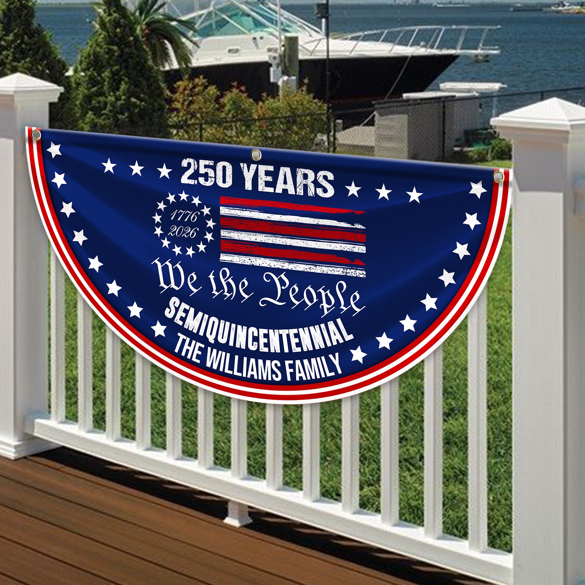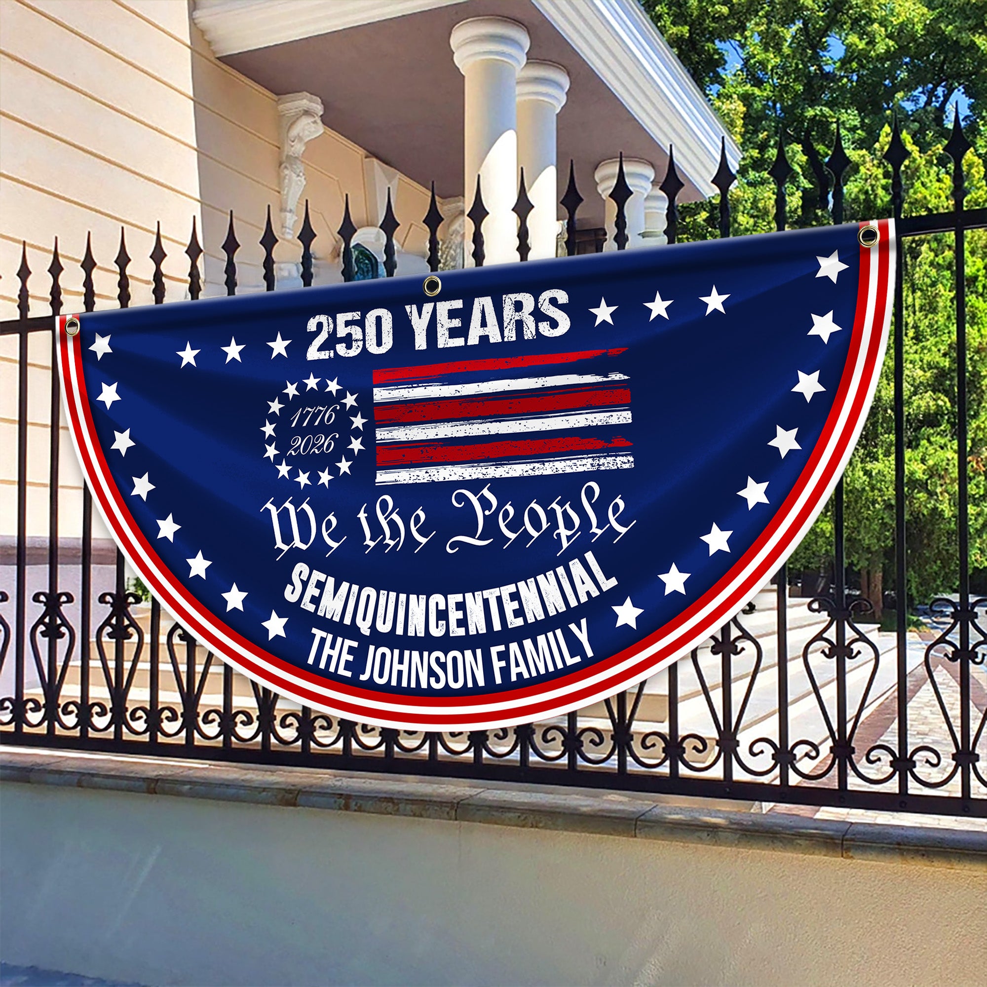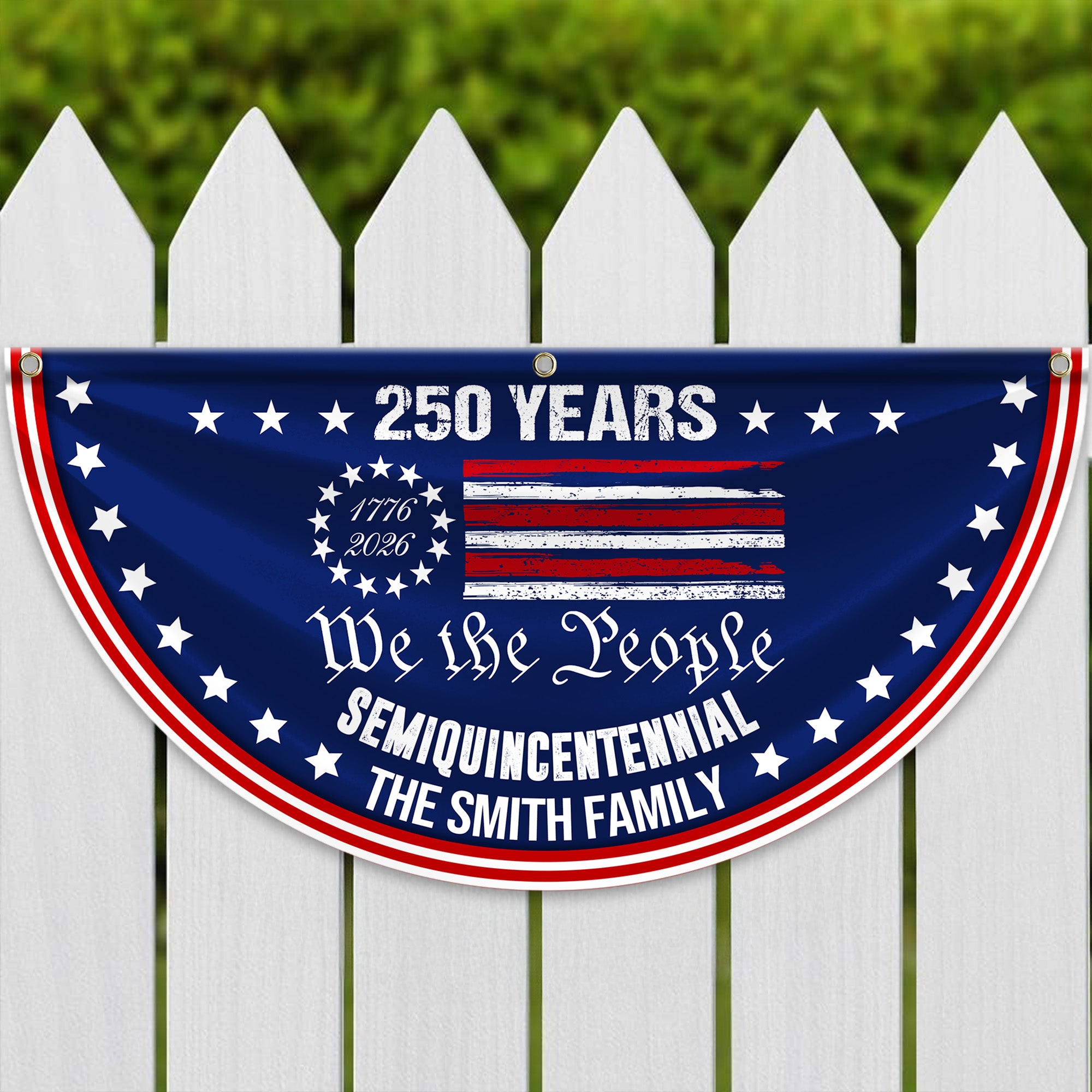 Celebrate American heritage and family pride with this striking Custom Family Name We The People America 250 Years Non-Pleated Fan Flag. Featuring personalized family names integrated into a patriotic design, this flag honors 250 years of American history with timeless appeal. The non-pleated fan style creates elegant movement and visual interest in any space. Perfect for displaying your family legacy while showing your patriotic spirit. An ideal gift for history enthusiasts, genealogy lovers, and anyone who treasures their American roots. Make a meaningful statement that combines personal identity with national pride.