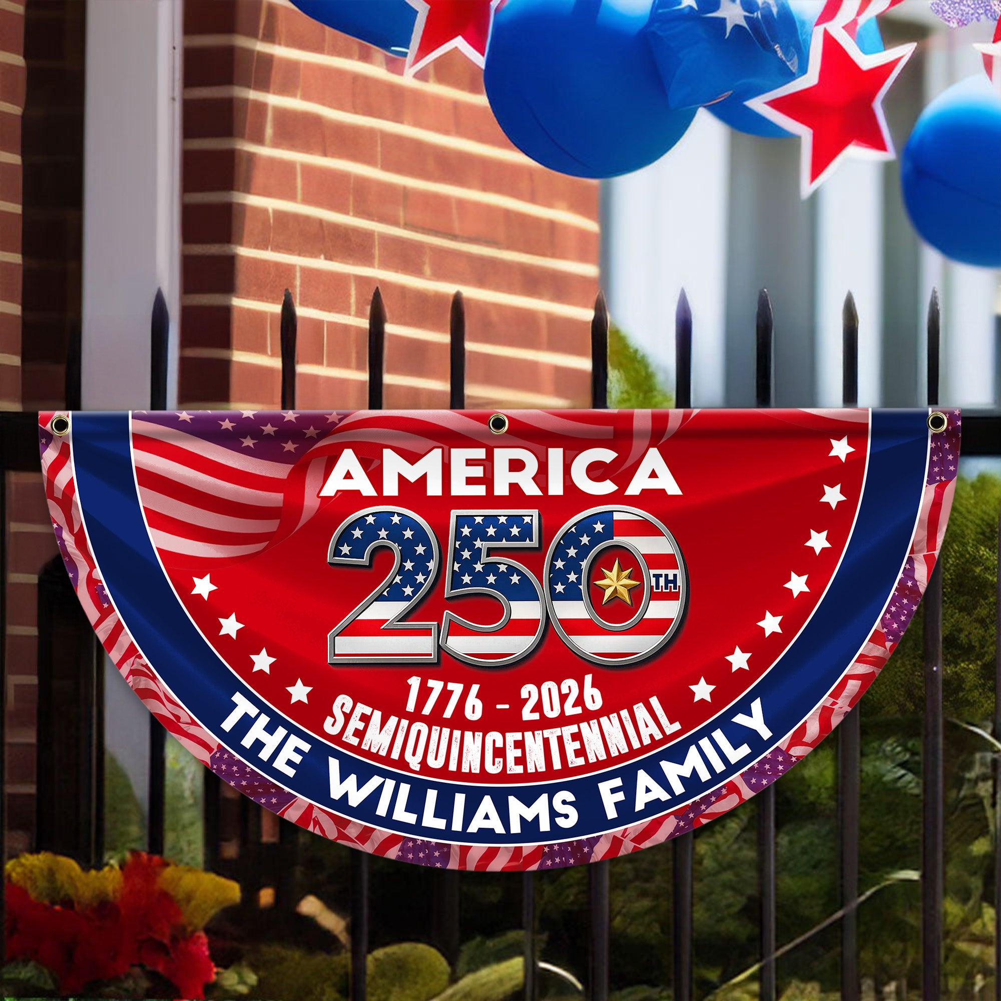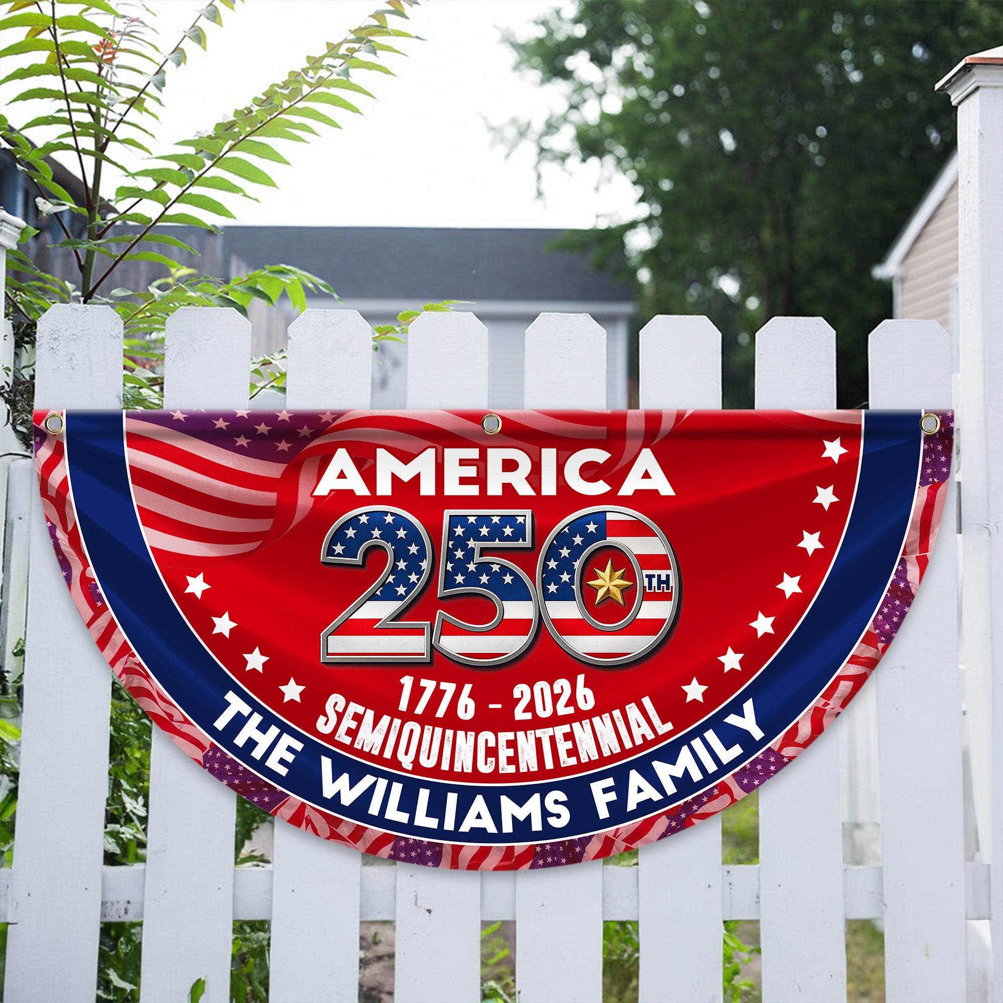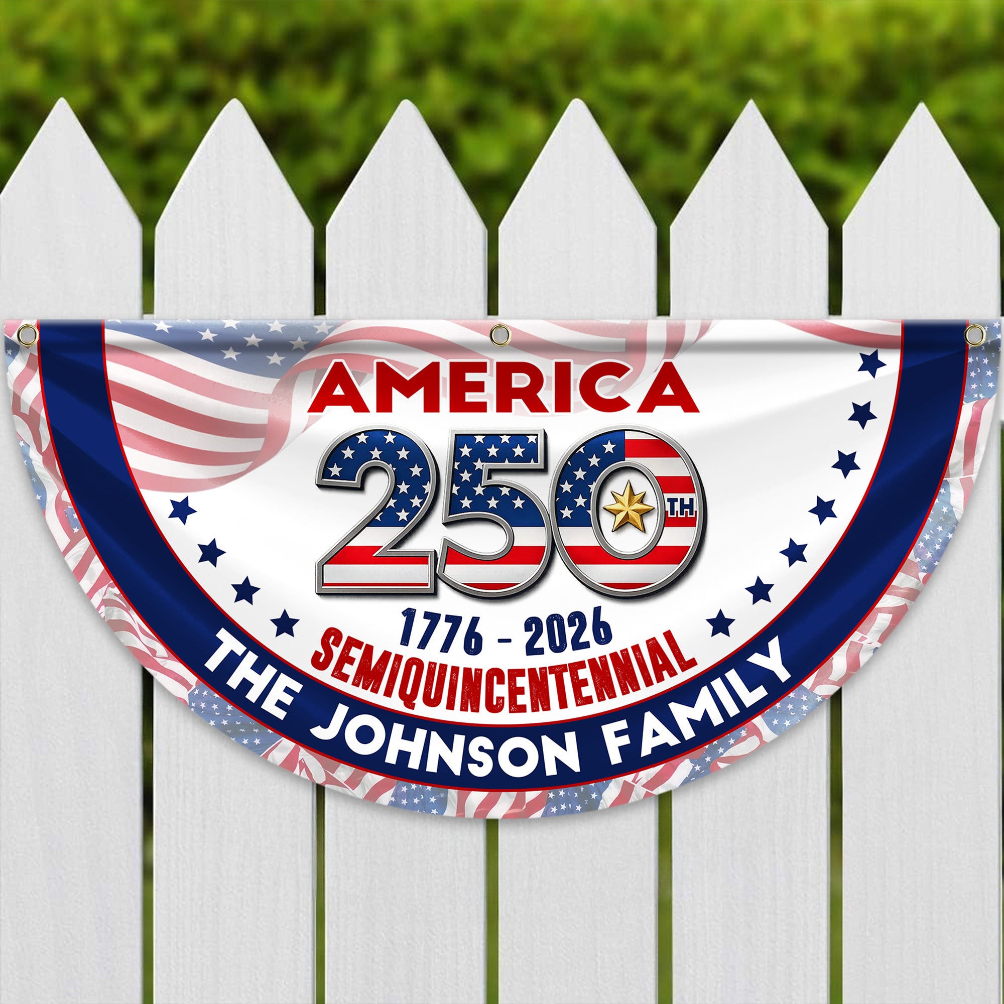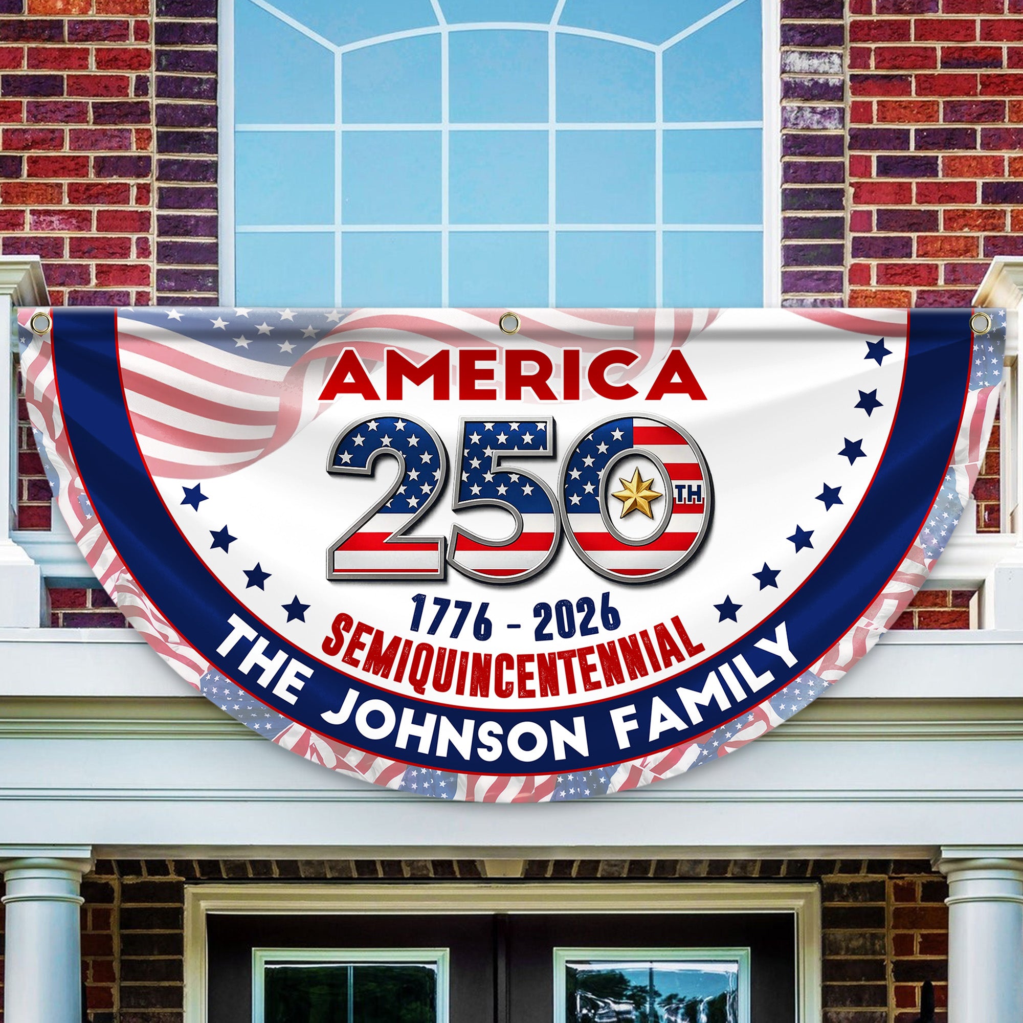 Celebrate America's 250th anniversary with this striking semiquincentennial fan flag, commemorating the nation's journey from 1776 to 2026. Featuring bold patriotic design without pleats, this non-pleated fan flag makes a powerful statement for Independence Day, historical events, or year-round display. Perfect for collectors, history enthusiasts, and proud Americans, it combines historical significance with eye-catching visual appeal. Durable construction ensures it withstands outdoor conditions while maintaining vibrant colors. Honor the past, celebrate the present—display your American pride with this exclusive commemorative piece that captures a quarter-millennium of history.