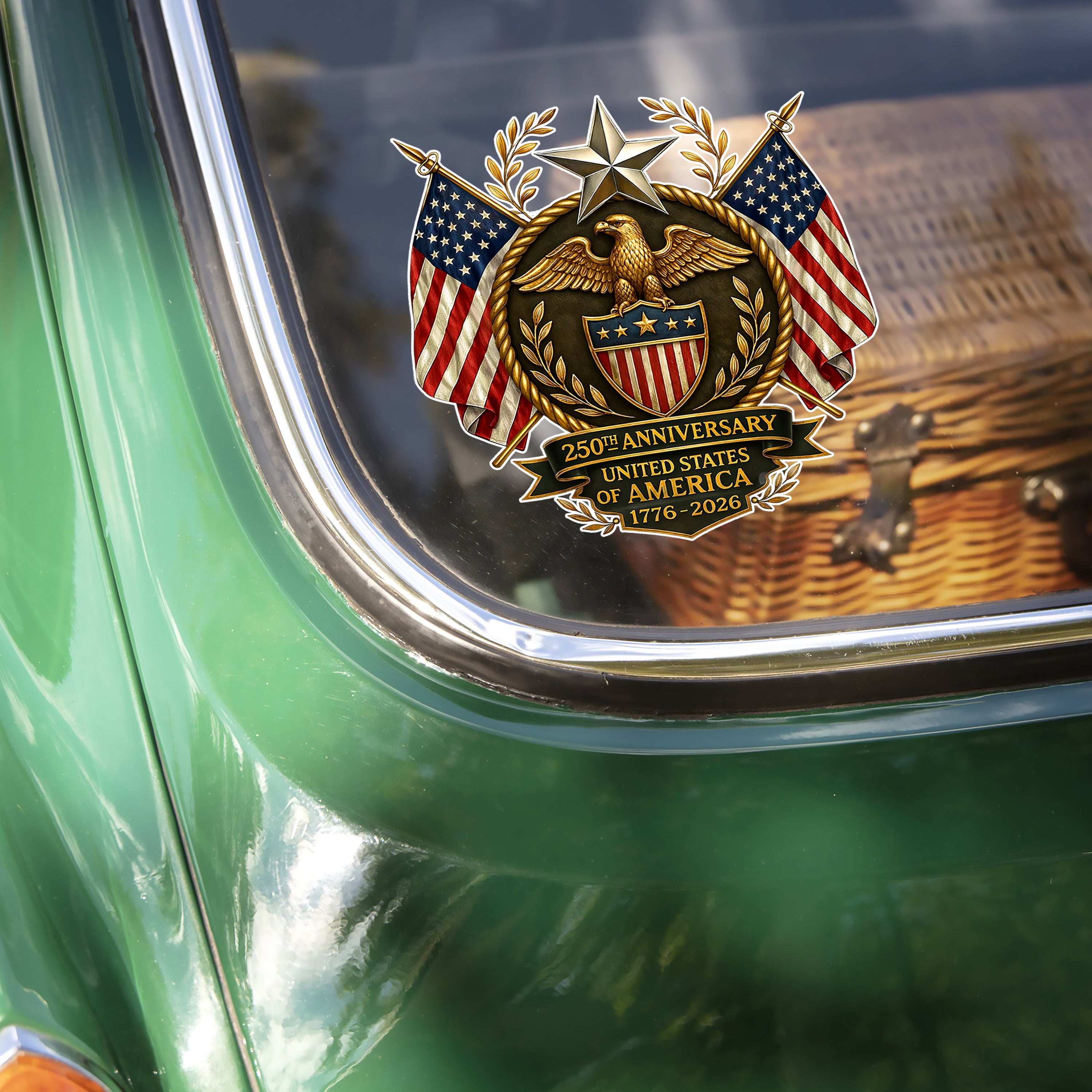 Celebrate America's 250th anniversary with this vibrant car window decal sticker. Designed to proudly display your patriotism, this durable decal adheres easily to any vehicle window, adding a festive touch wherever you go. Show your love for the USA's rich history and join the nationwide celebration in style. Perfect for all Americans eager to commemorate this unforgettable milestone.
