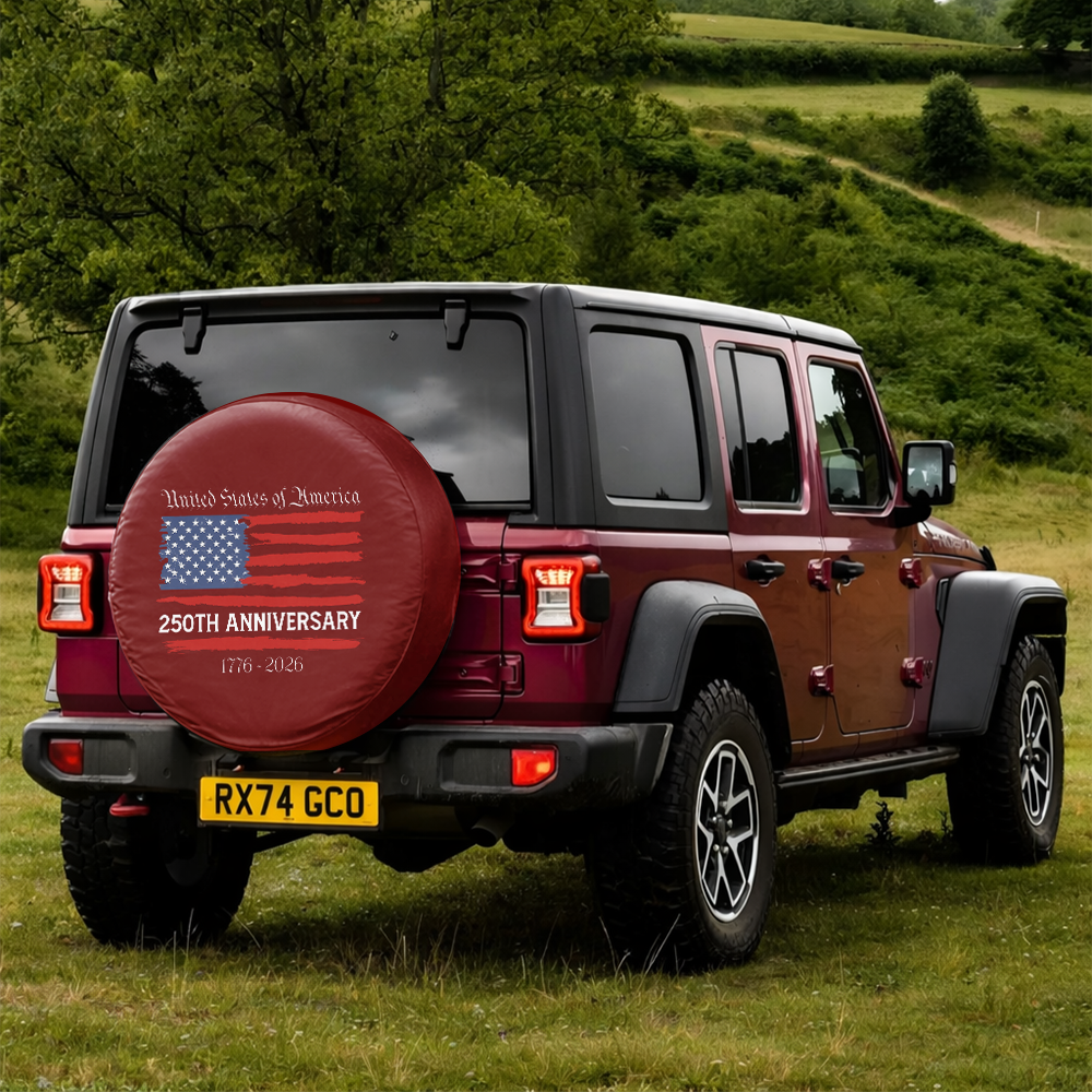 Celebrate America's milestone with this striking USA 250th Anniversary Tire Cover. Featuring bold patriotic design, this durable cover protects your spare tire from UV rays, weather damage, and fading while showcasing your national pride. Perfect for trucks, SUVs, and RVs, it combines functionality with timeless American spirit. Easy to install and built to last, this commemorative cover transforms your vehicle into a rolling tribute to 250 years of history. Make a statement on every journey.