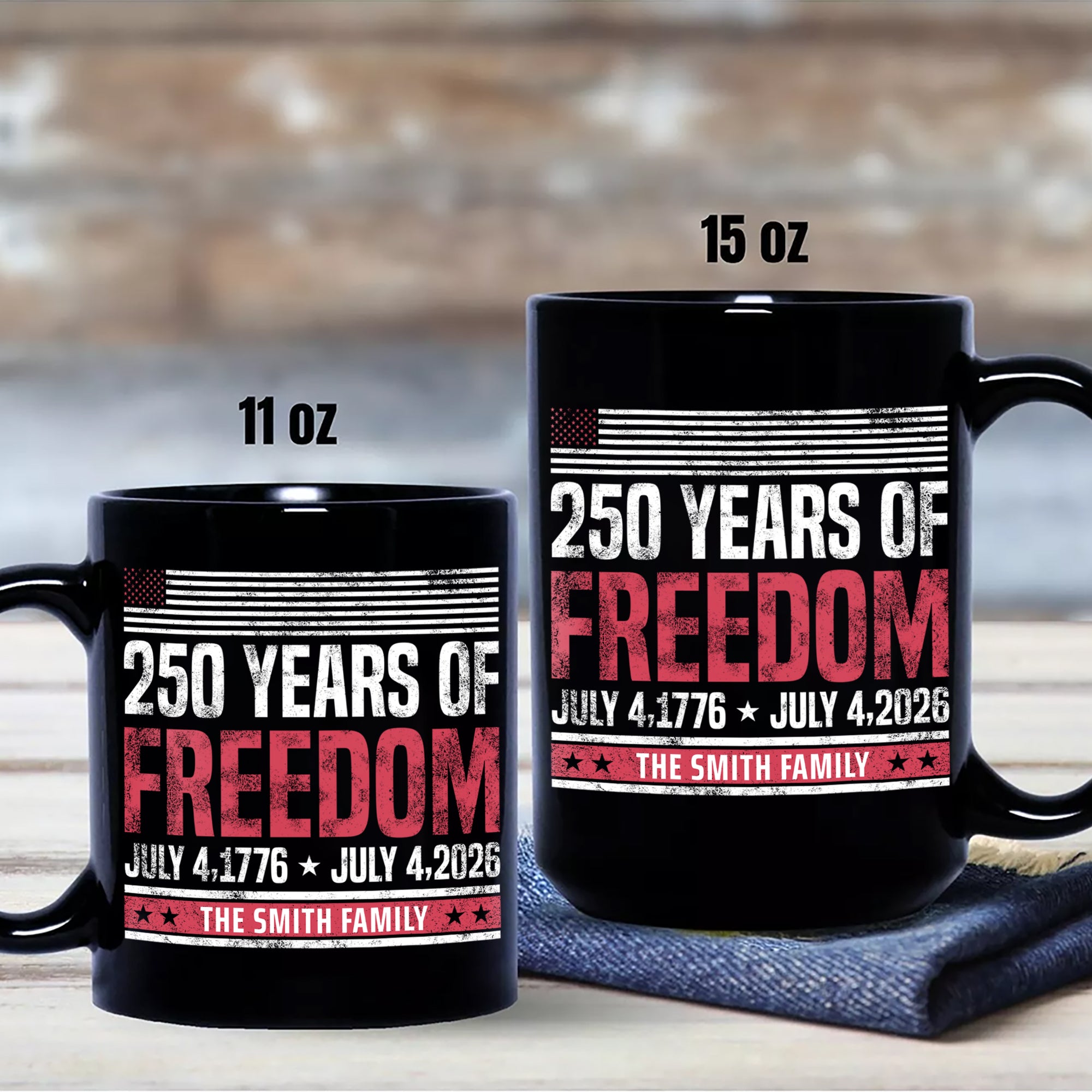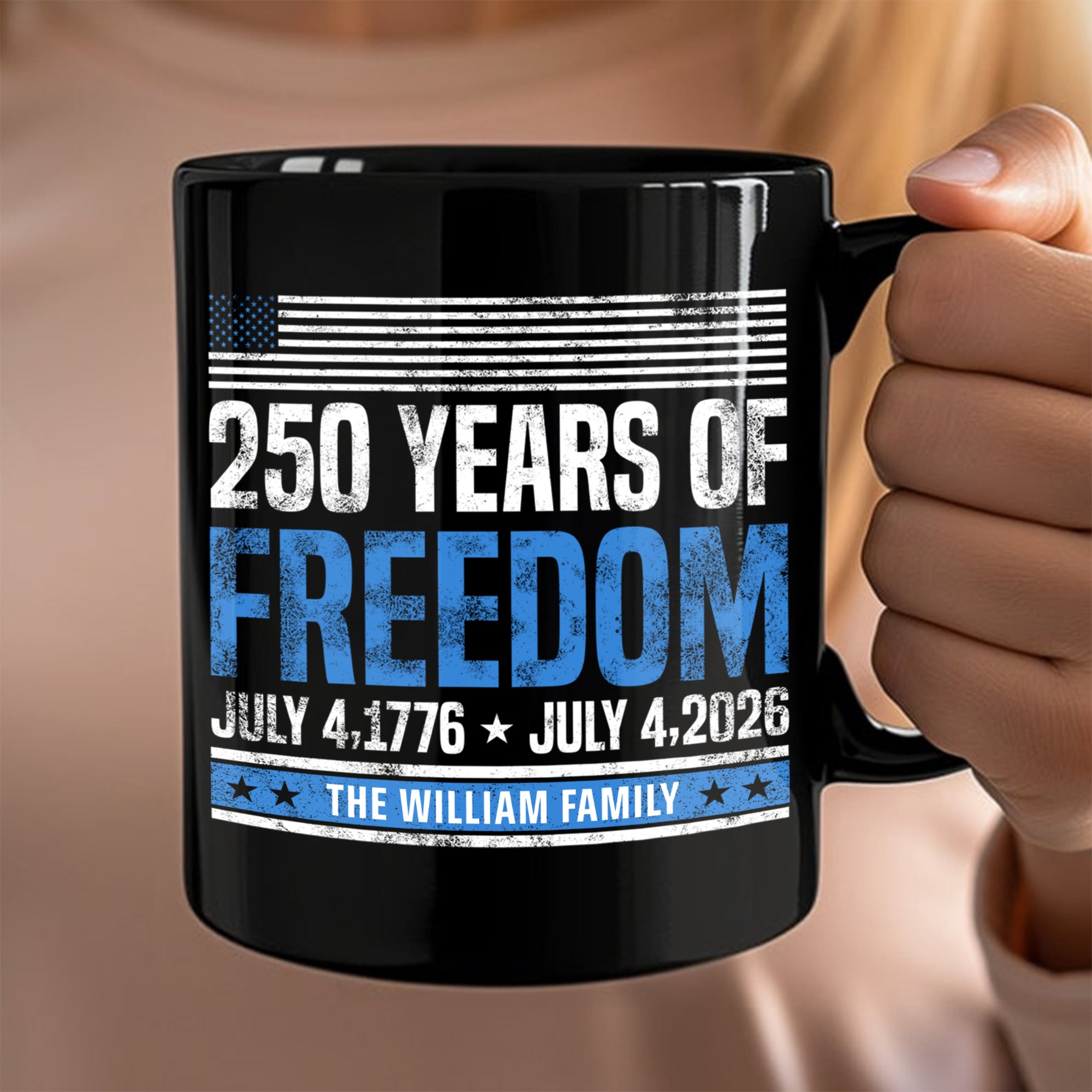 Celebrate America's milestone with this commemorative black mug featuring a custom family name and patriotic "250 Years Of Freedom 1776-2026" design. Perfect for history enthusiasts and proud Americans, this durable ceramic mug holds your favorite beverages while honoring the nation's quarter-century legacy. Personalize it with your family name to make it a meaningful keepsake or gift. Dishwasher safe and built to last, it's an ideal way to commemorate this historic anniversary in your daily routine.