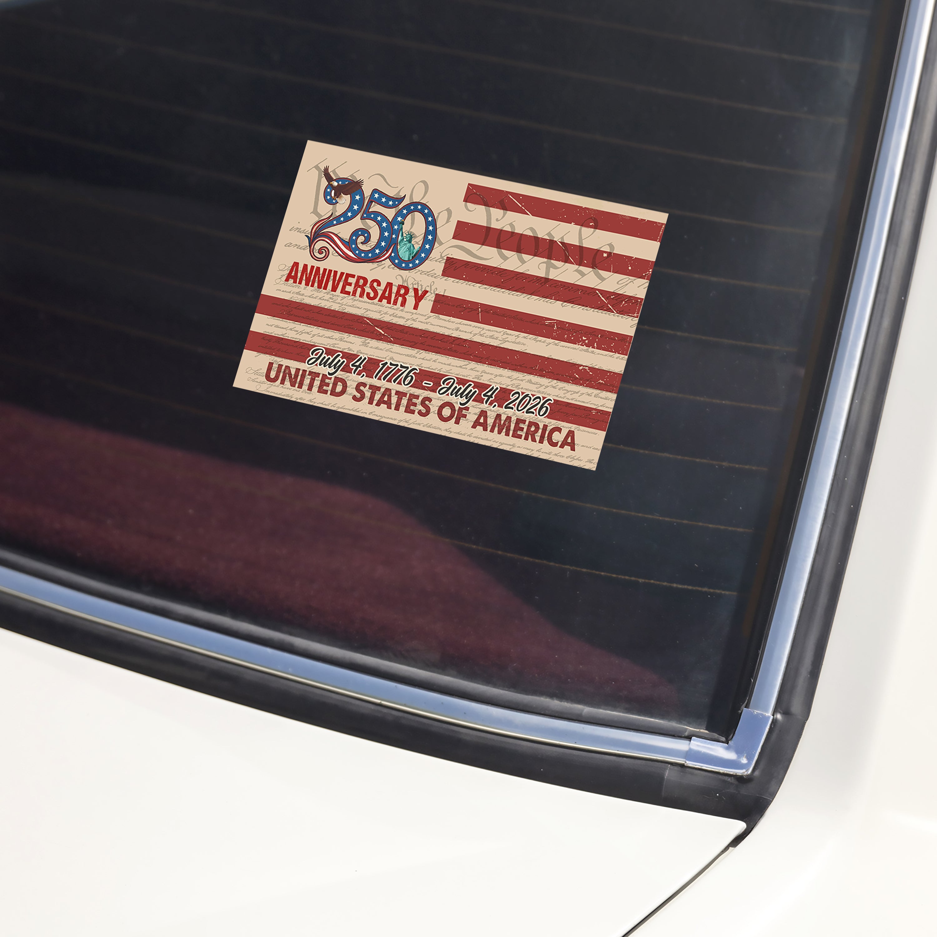 Celebrate America's 250th anniversary with this vibrant car window decal sticker. Designed to proudly display your patriotism, this durable decal adheres easily to any vehicle window, adding a festive touch wherever you go. Show your love for the USA's rich history and join the nationwide celebration in style. Perfect for all Americans eager to commemorate this unforgettable milestone.