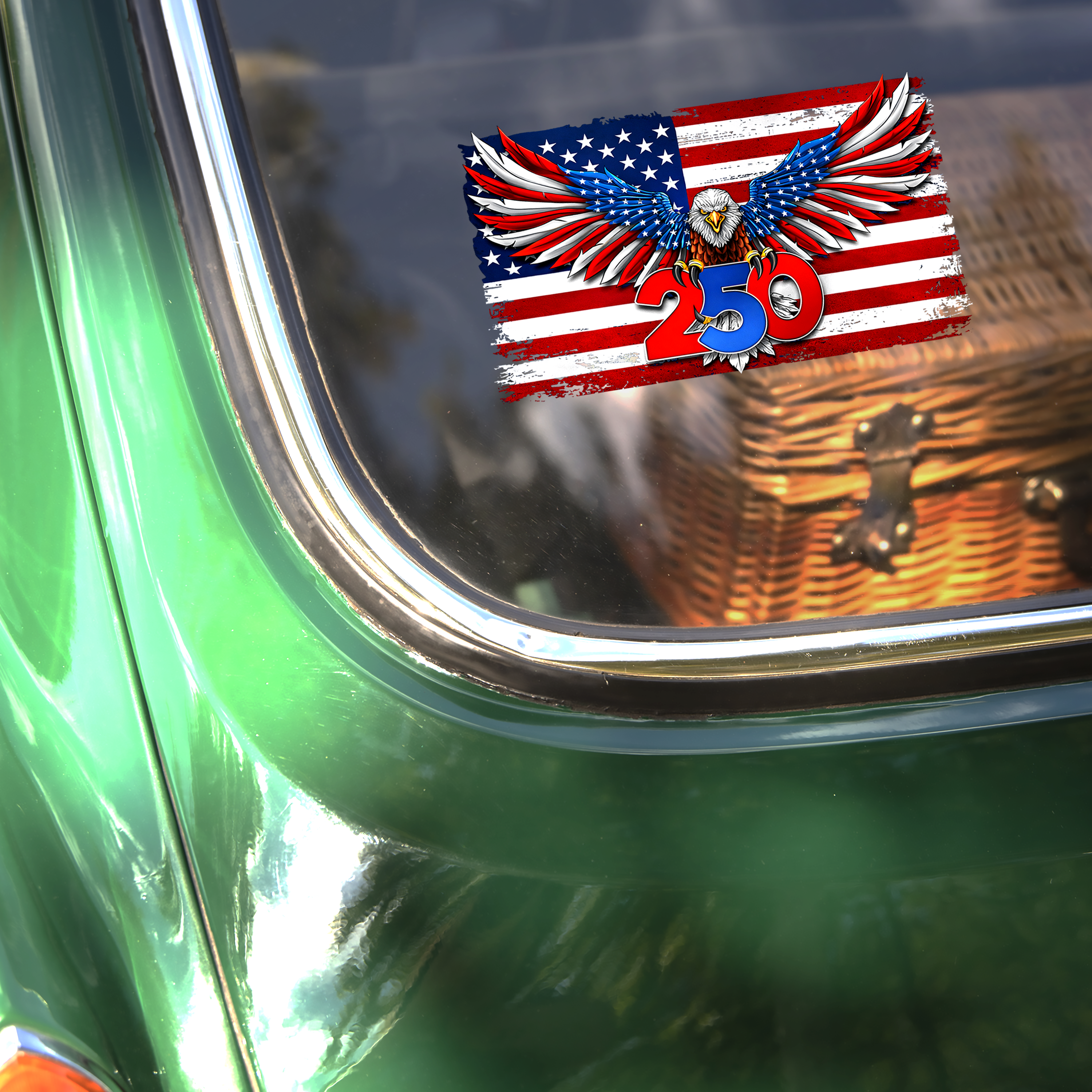 Honor America's semiquincentennial with this majestic eagle design. Commemorating 250 years of independence from 1776 to 2026, this patriotic car window decal captures the strength and freedom symbolized by the nation's iconic bird. The eagle represents courage, vision, and the soaring spirit of American achievement throughout the centuries. Built to endure harsh weather and intense sunlight, this premium decal maintains its vibrant colors and sharp details for years. Whether you're celebrating this historic milestone or expressing your patriotic devotion, this striking design transforms any vehicle into a moving tribute to the United States' remarkable journey. Display it with pride and honor the legacy of liberty that defines our nation.