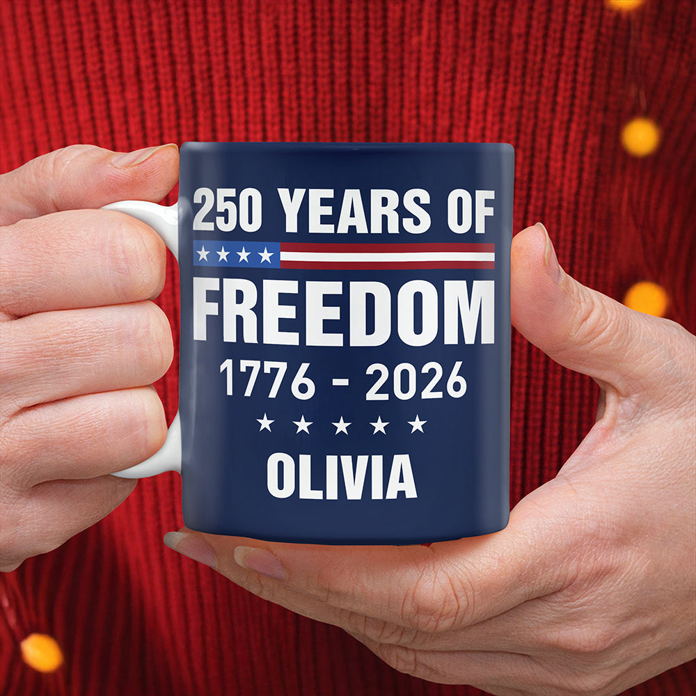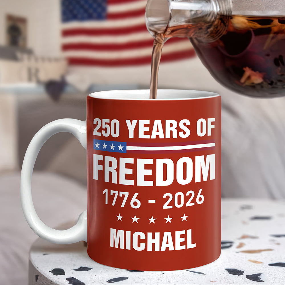 Celebrate America's quarter-century milestone with this commemorative mug honoring 250 years of freedom. Featuring bold 1776-2026 design elements, this custom piece makes a meaningful gift for patriots and history enthusiasts alike. Perfect for daily coffee breaks or display on your shelf, it's a timeless reminder of American heritage and independence.