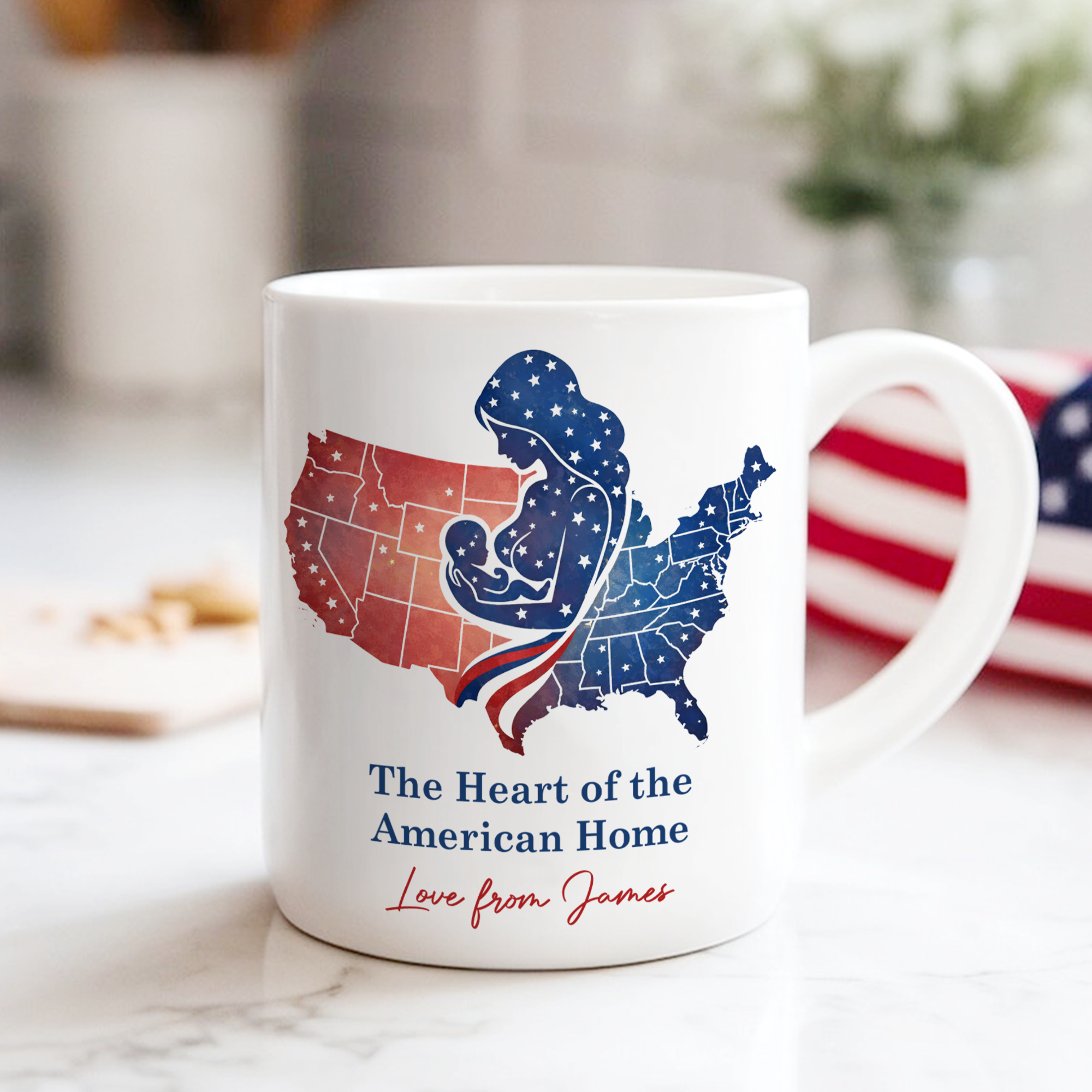 Celebrate what matters most with this personalized white mug that transforms your kitchen into a reflection of your values. Featuring a custom name paired with "The Heart Of The American Home," this ceramic vessel becomes a daily reminder of family, tradition, and togetherness. Perfect for morning coffee, afternoon tea, or as a meaningful gift, it combines practicality with heartfelt sentiment. Durable and dishwasher-safe, this mug brings warmth to every moment shared around the table. Make it uniquely yours and cherish the memories it holds.