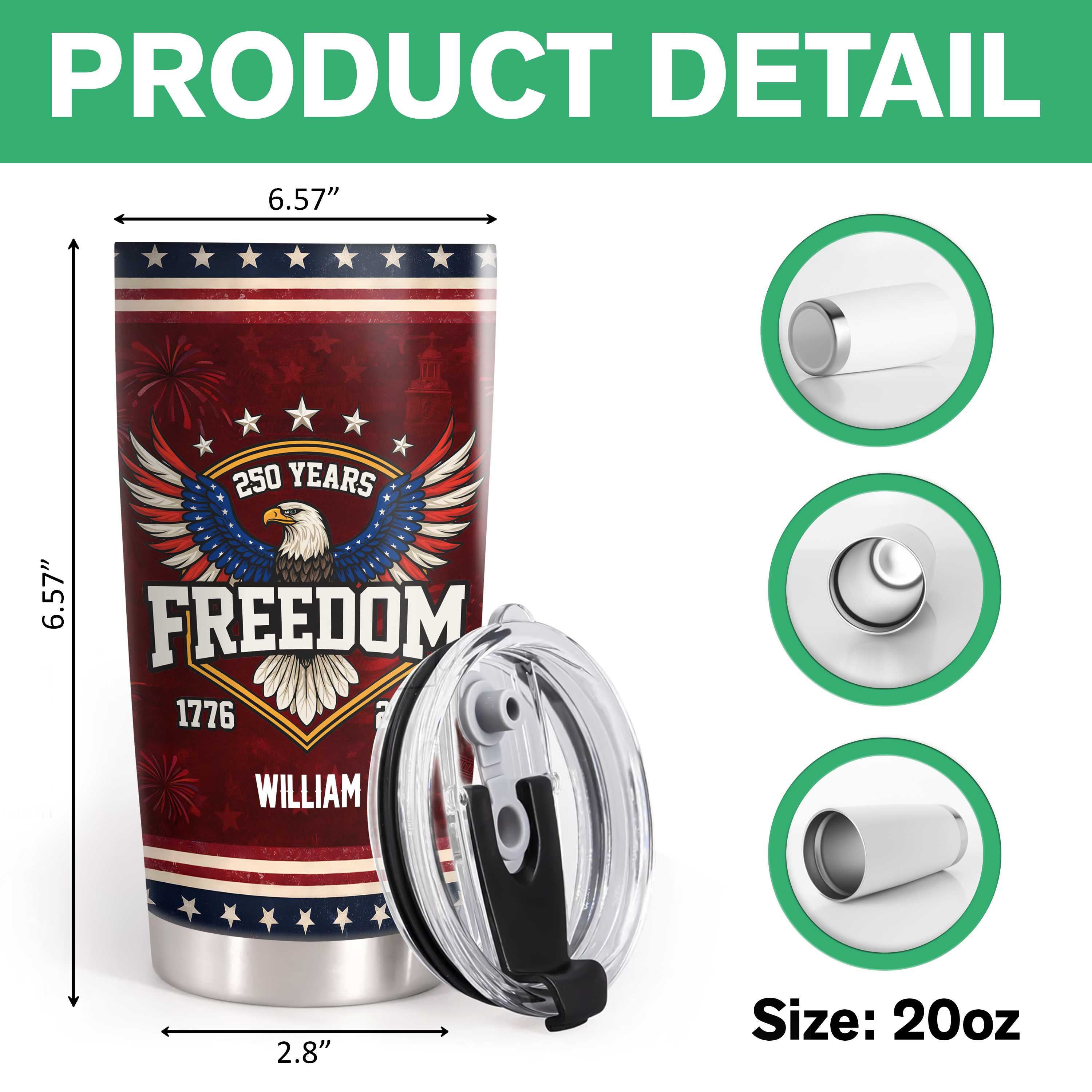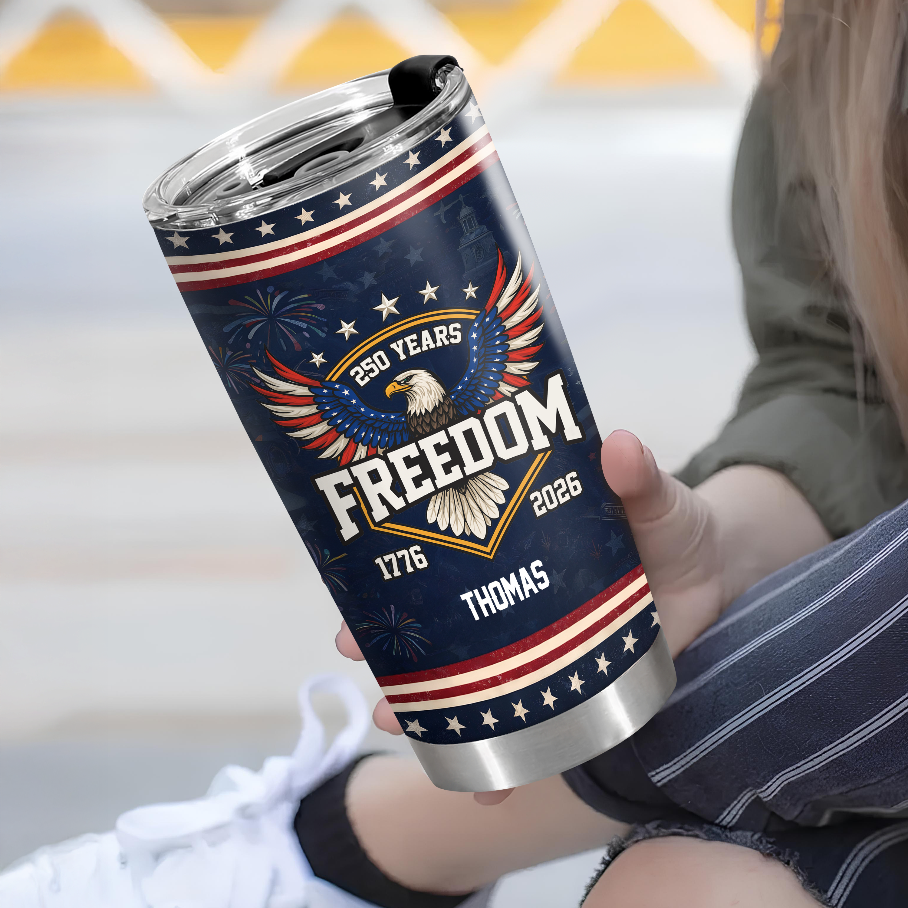 Celebrate America's quarter-millennium milestone with this striking anniversary tumbler. Personalized with your name, this 250-year commemorative design honors the nation's journey from 1776 to 2026. The fat tumbler shape provides superior insulation and a comfortable grip, keeping your beverages at the perfect temperature whether you're at home, the office, or on the go. Durable construction ensures this patriotic piece becomes a cherished keepsake for years to come. Perfect for history enthusiasts, patriots, and anyone who wants to carry a piece of American heritage with them daily.