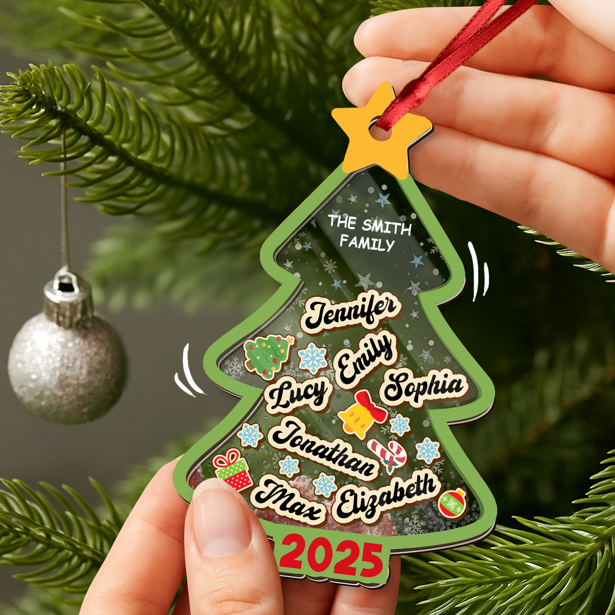 Celebrate your family's bond with this enchanting personalized shaker ornament. Watch as glittering snowflakes dance around your custom Christmas tree, each name beautifully displayed to honor those you cherish most. Perfect for creating lasting holiday memories, this unique keepsake transforms your tree into a heartfelt tribute to family togetherness. Whether decorating your own home or gifting to loved ones, this custom ornament becomes a treasured tradition year after year. Make this Christmas unforgettable with a personalized touch that captures the spirit of family.