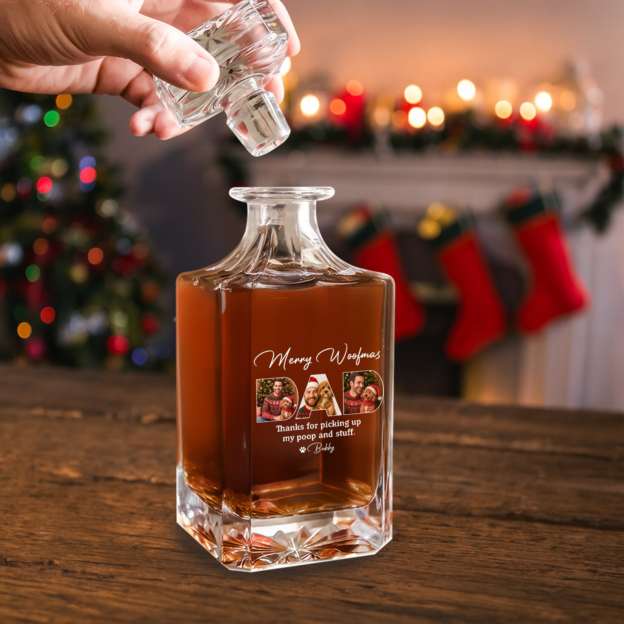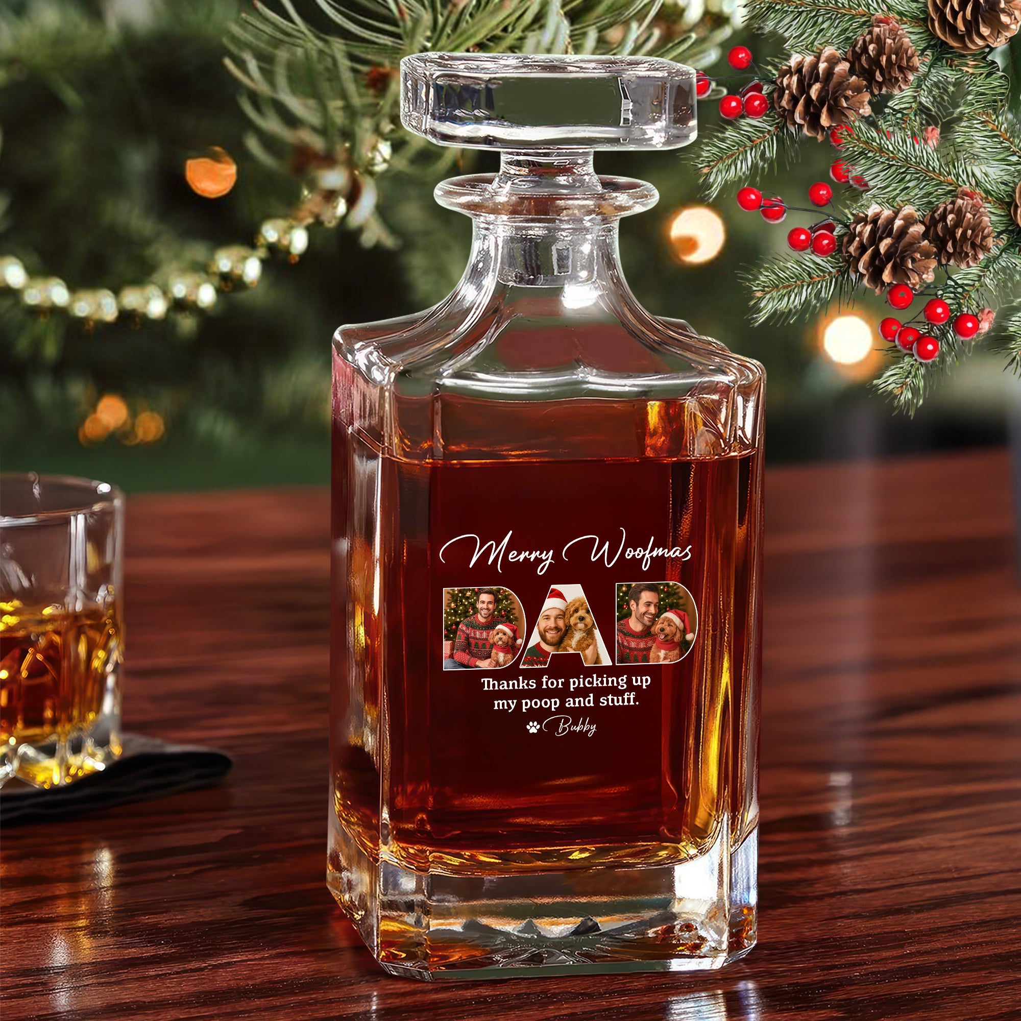 Celebrate the dog dad in your life with this custom photo decanter, a perfect blend of humor and heartfelt thanks. Personalized with a photo and the playful message "Thanks For Picking Up My Poop And Stuff," it’s a unique gift that shows appreciation for all the little things dog dads do. Ideal for dog lovers who enjoy a stylish way to unwind, this decanter adds a personal touch to any home bar or display. Give a gift that’s both practical and memorable, sure to bring smiles and warm moments.