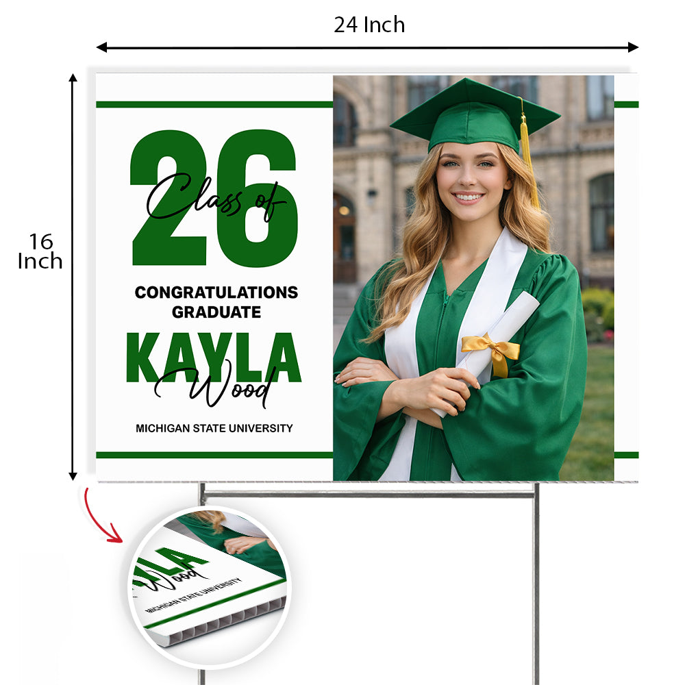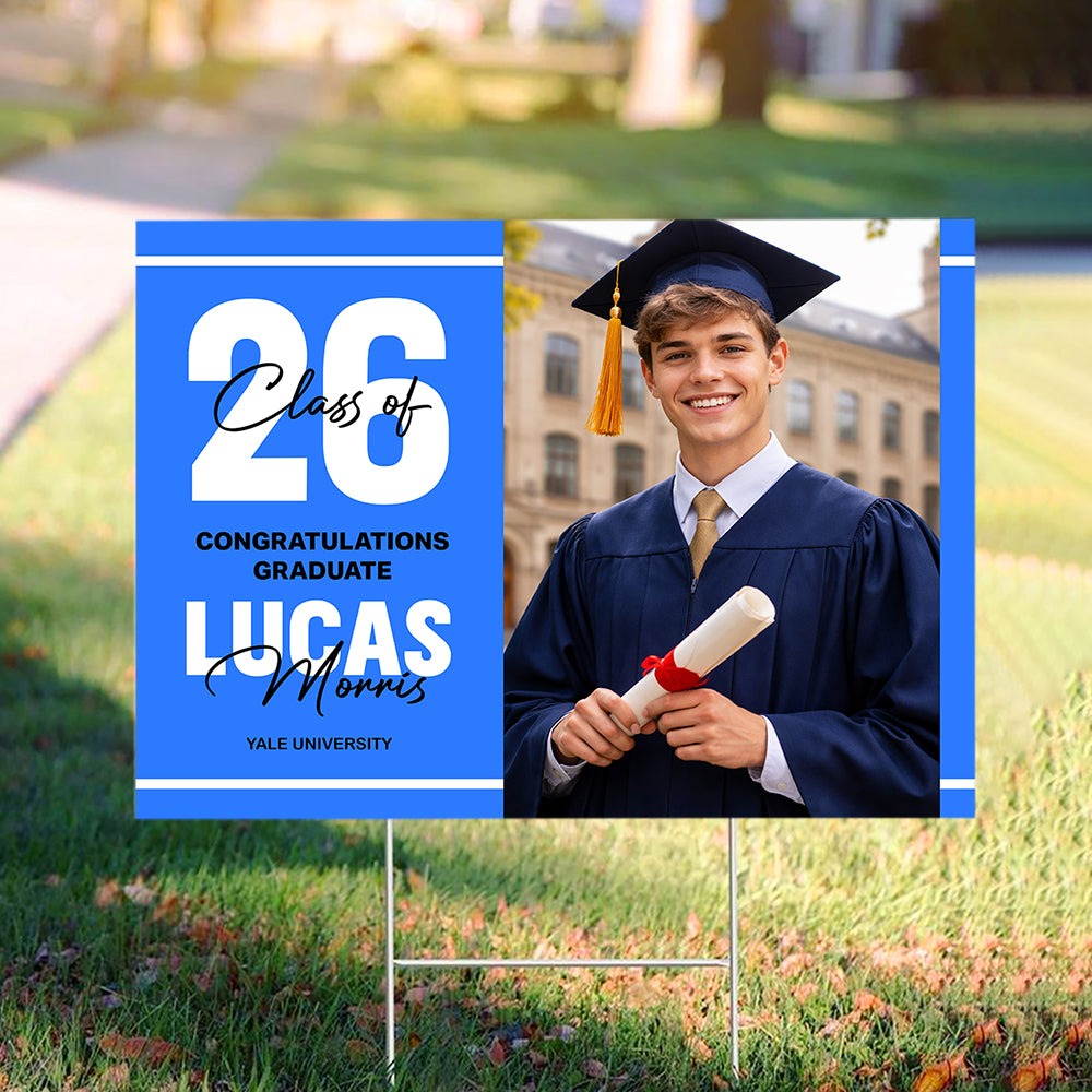 Celebrate your graduate's milestone with a personalized yard sign featuring their photo and class year. This custom Class of 2026 sign makes a bold statement in any front yard, driveway, or garden—perfect for honoring achievements and creating lasting memories. Crafted for outdoor durability, this sign withstands weather while displaying your graduate's image prominently. Ideal for graduation parties, senior photos, or as a keepsake decoration that captures this special moment in time. Customize with your own photo to make it uniquely theirs.