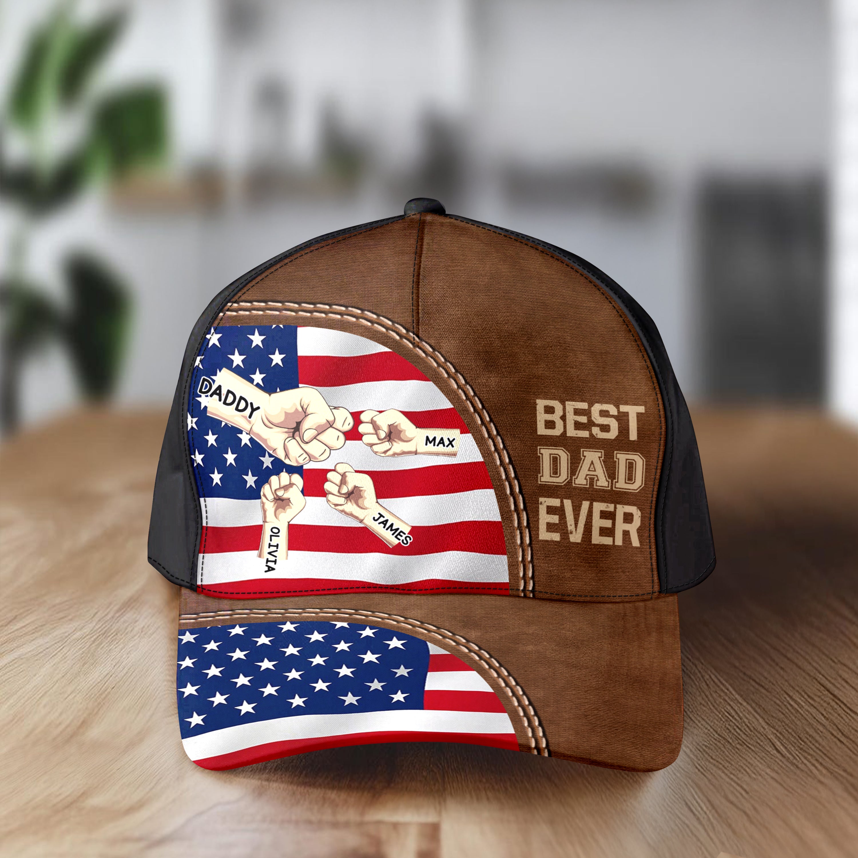 Celebrate dad with this personalized classic cap featuring a bold "Best Dad Ever" design, accented by the American flag and fist bumps. Crafted for comfort and style, it makes a thoughtful gift that shows appreciation and pride. Perfect for everyday wear, this cap lets dad carry your love wherever he goes.
