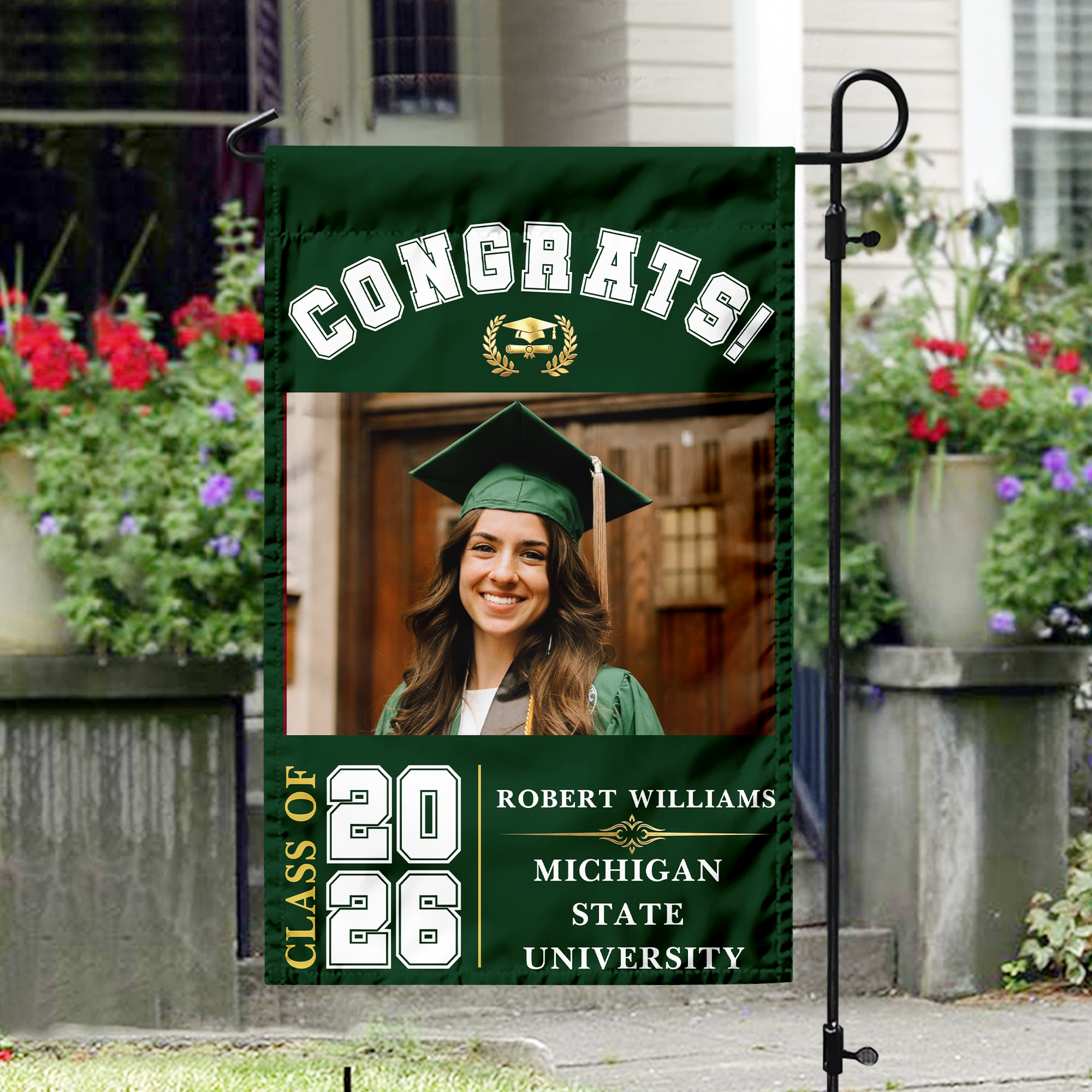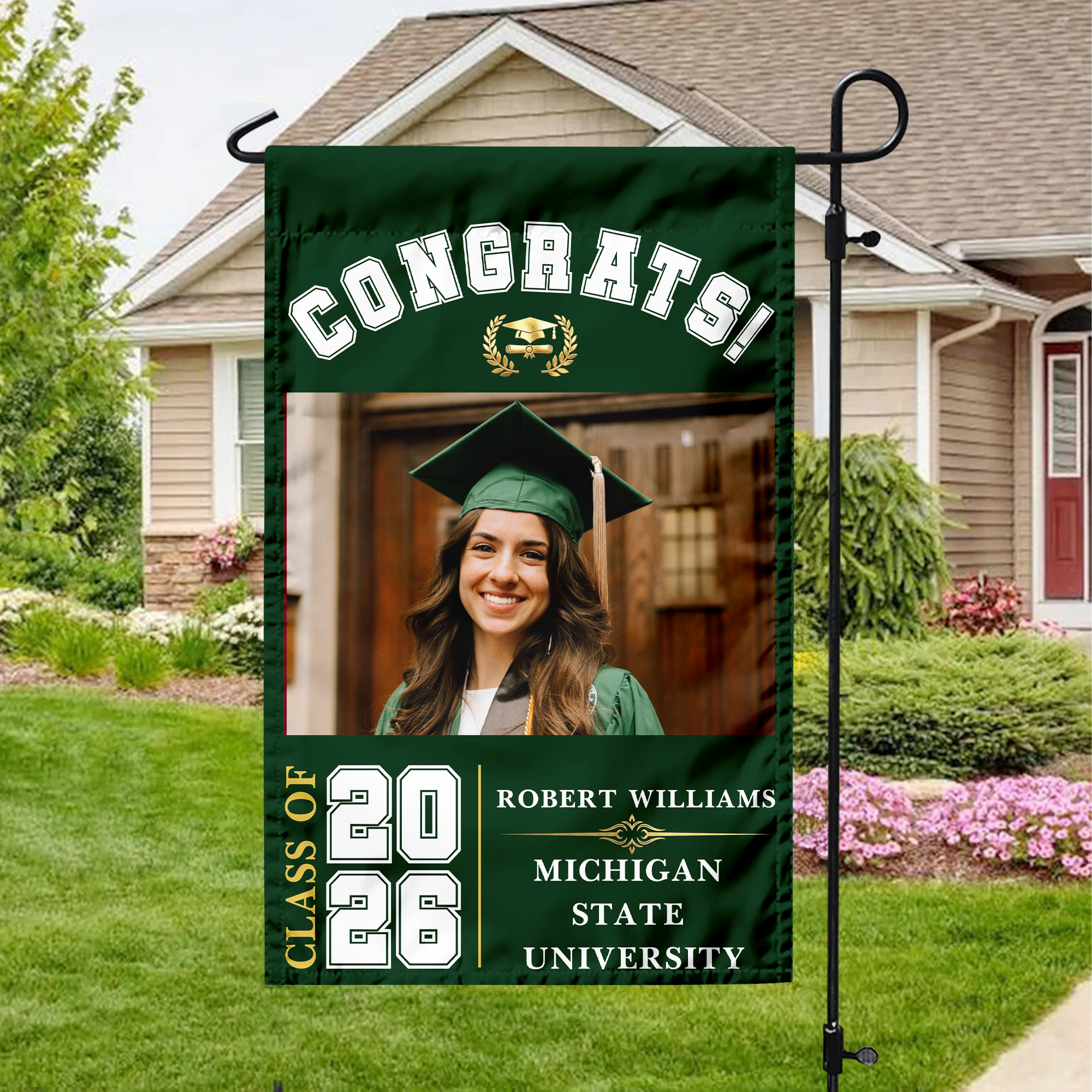Celebrate the Class of 2026 with this personalized “Congrats” garden flag. Customize it with a name or special detail to create a unique and eye-catching outdoor display. Perfect for gardens, yards, or porches, this flag proudly showcases your achievement while adding a festive touch to your graduation celebration.