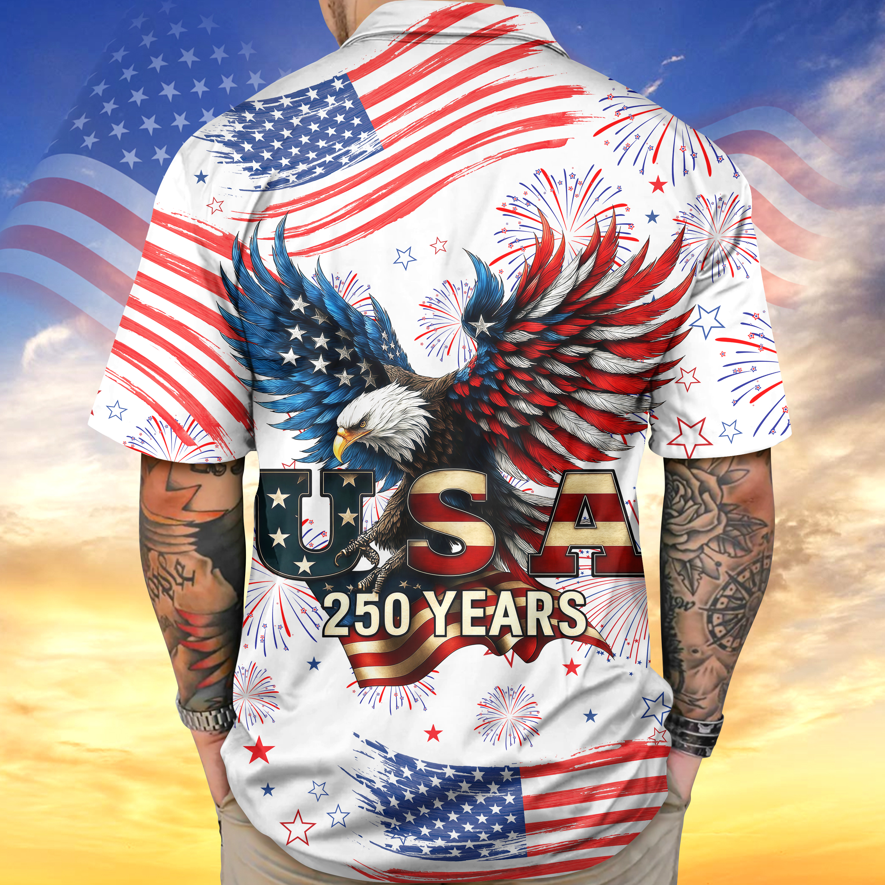 Celebrate America's legacy with this striking patriotic Hawaii shirt featuring a majestic bald eagle design. Perfect for the 250th anniversary, this vibrant piece combines classic Americana symbolism with tropical flair. The bold eagle imagery represents freedom and national pride, while the relaxed Hawaiian cut ensures comfort for any occasion—from casual gatherings to patriotic celebrations. Crafted with quality materials, this shirt makes a powerful statement about your love for the country. Whether you're attending a Fourth of July party, family reunion, or simply want to showcase your patriotic spirit, this unique blend of eagle symbolism and island style delivers both style and meaning. Stand out and inspire with wearable American pride.