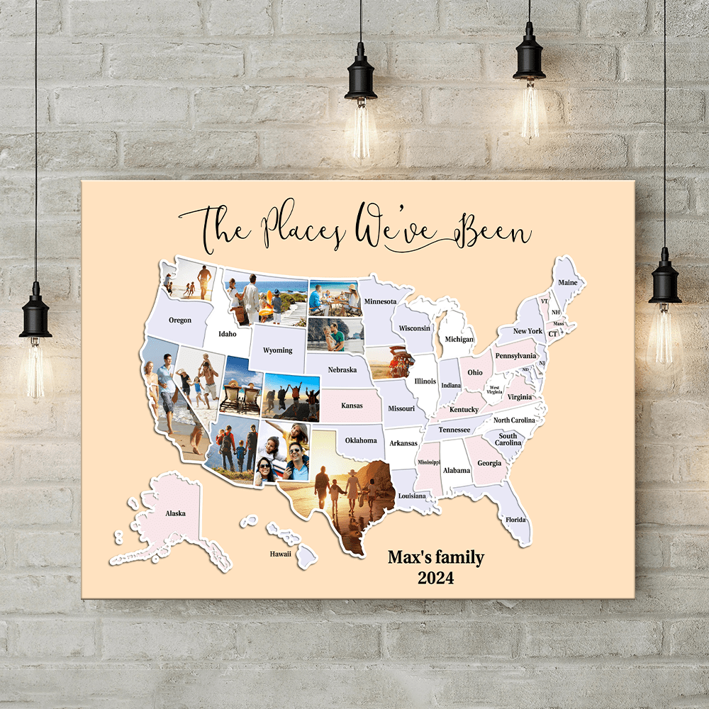 Personalized Custom Print Canvas  base on 50 States Map then add photos from each of the 50 US states to capture a lifetime of memories and create a one-of-a-kind map showing where you've been or where you're going. This 50 States Photo Map makes a great gift for anyone who likes to travel around the United States.