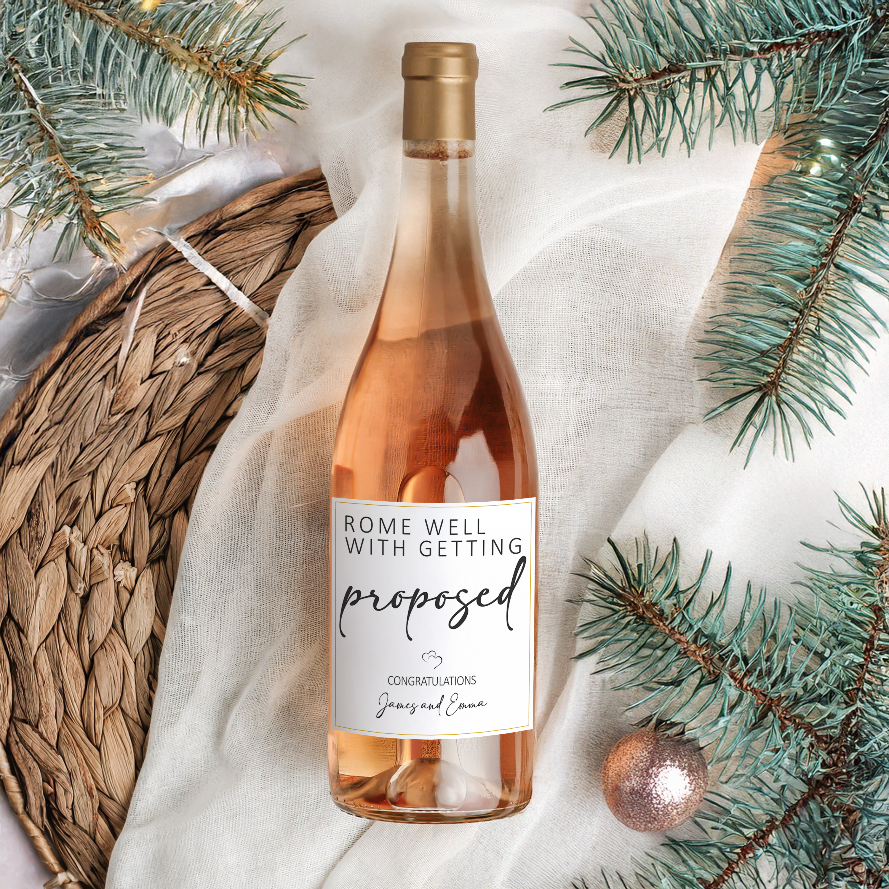 Celebrate love with this personalized wine label, the perfect congratulatory gift for engagements and special occasions. Custom-designed to add a unique touch, it transforms any bottle into a memorable keepsake. Make your gift stand out and create lasting memories with this elegant and thoughtful addition.