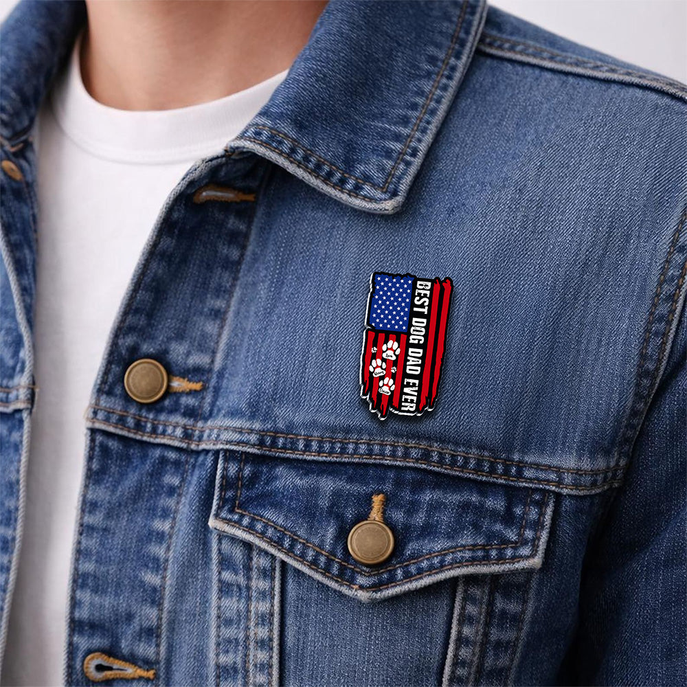 Celebrate your love for your furry friend with this unique custom dog dad enamel pin.Featuring a bold USA flag design with personalized paw prints and names, this pin proudly shows off your title as the Best Dog Dad Ever in a fun and meaningful way.