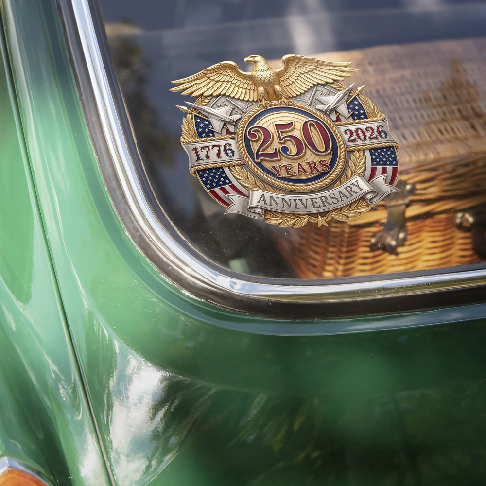 Celebrate America's 250th anniversary with this vibrant car window decal sticker. Designed to proudly display your patriotism, this durable decal adheres easily to any vehicle window, adding a festive touch wherever you go. Show your love for the USA's rich history and join the nationwide celebration in style. Perfect for all Americans eager to commemorate this unforgettable milestone.