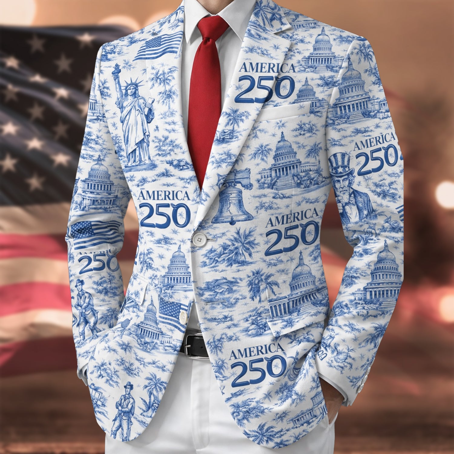Commemorate America's 250th anniversary in timeless style with this exclusive men's suit featuring a striking eagle design honoring 1776-2026. Crafted for the patriotic gentleman, this personalized piece blends classic tailoring with meaningful symbolism, making it the perfect choice for celebrating this historic milestone.