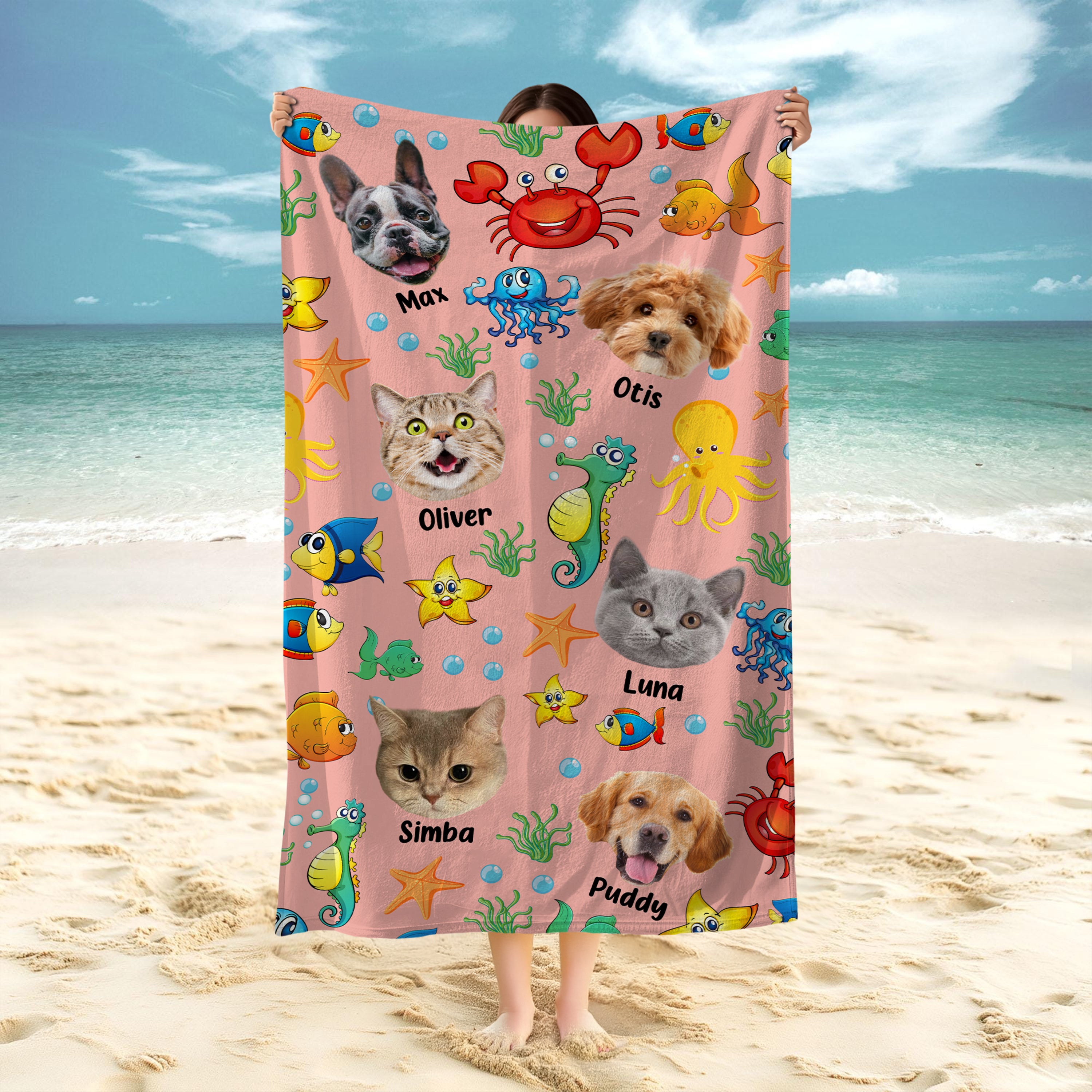 Make a splash with our custom pet face beach towels featuring your furry friend surrounded by delightful watercolor sea creatures! These eye-catching, high-quality towels showcase your beloved pet in a whimsical underwater world. Perfect for beach trips, pool parties, or as unique gifts for pet lovers. Turn heads and celebrate your pet in style with these one-of-a-kind summery towels that combine personality and practicality!