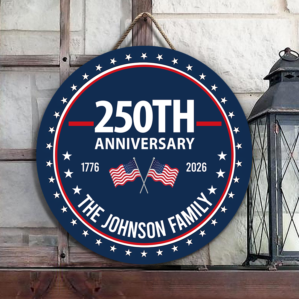 Celebrate a quarter-century of American heritage with this striking personalized door sign. Commemorating 250 years of freedom, this custom family name piece transforms your entryway into a patriotic statement. Crafted with attention to detail, it blends timeless Americana aesthetics with modern personalization, making it the perfect addition for families who take pride in their history and values.