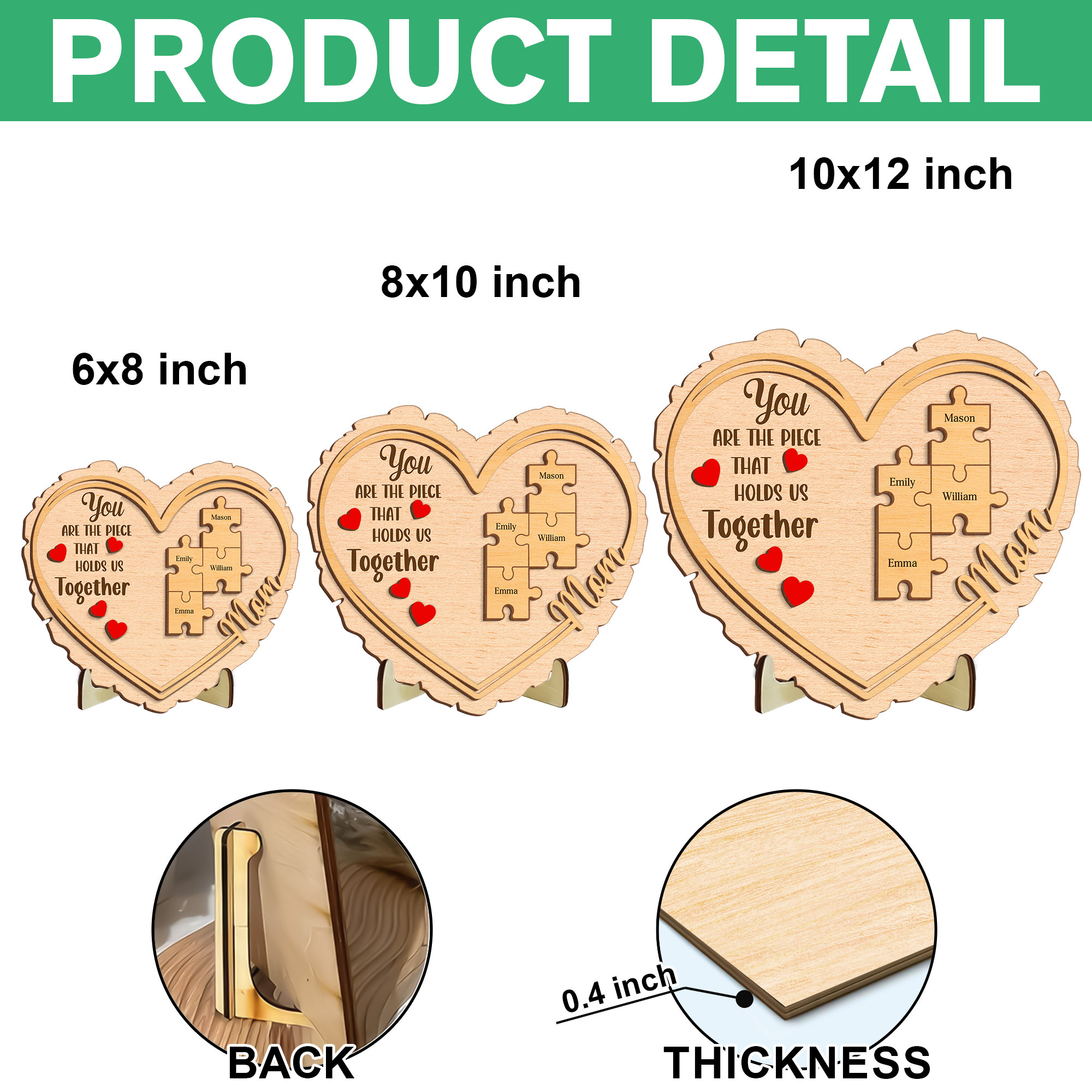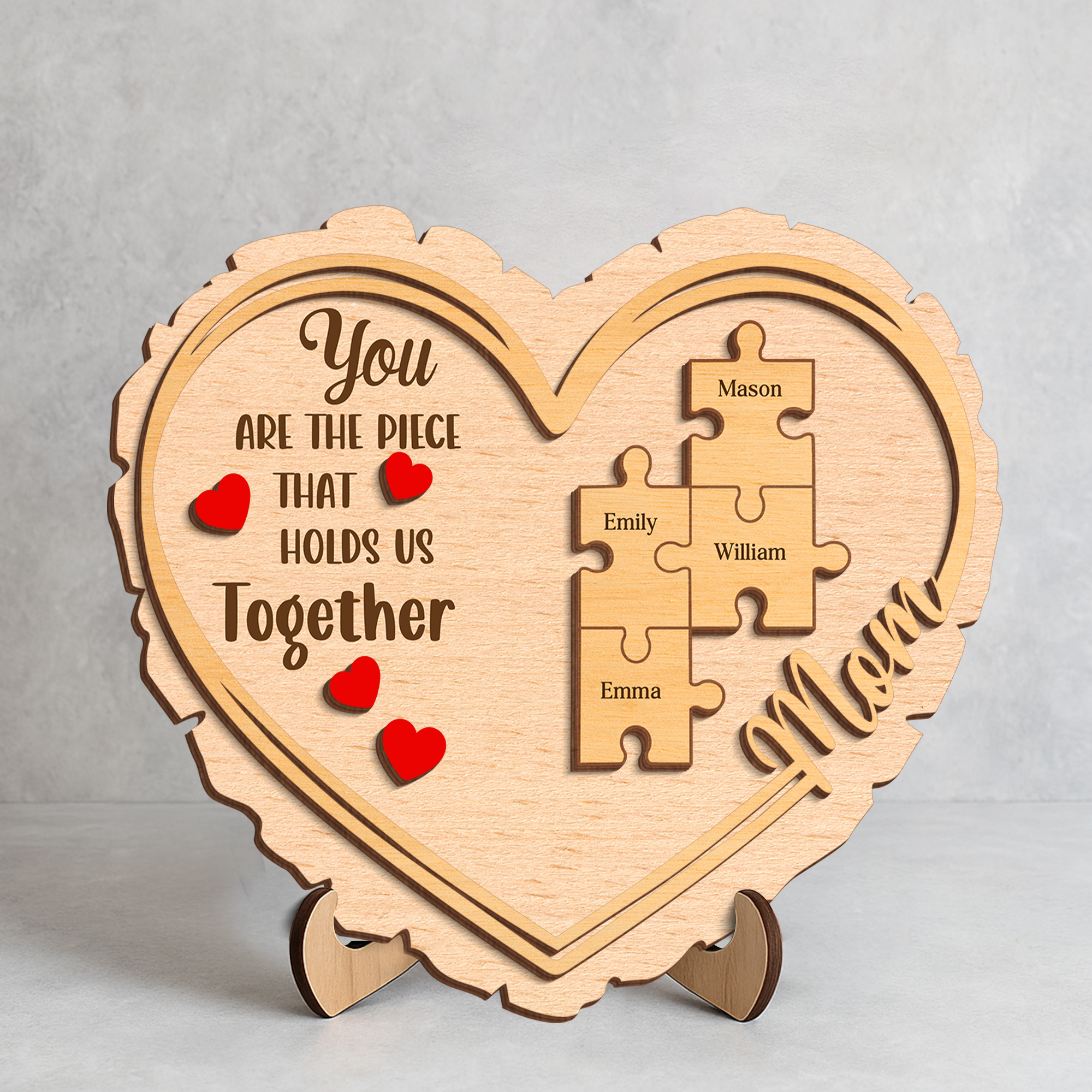 Celebrate the heart of your family with this beautiful 2-layered wooden plaque, personalized with your children's names. The touching message "You Are The Piece That Holds Us Together" perfectly captures a mother's irreplaceable role. Crafted from quality wood with elegant layering, this keepsake makes a meaningful Mother's Day gift that she'll treasure for years. Ideal for home décor, it's a heartfelt way to show appreciation for the woman who keeps your family united.
