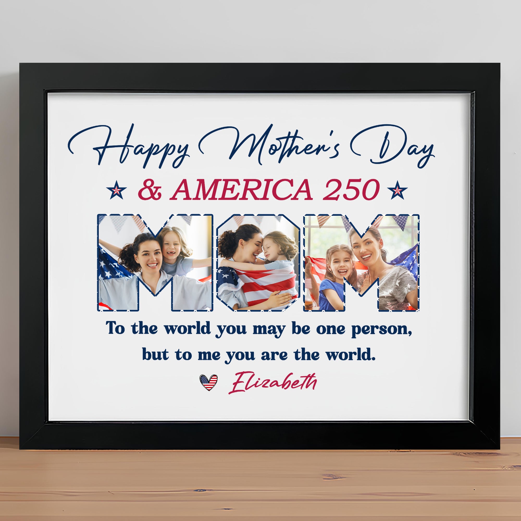 Celebrate Mom and a historic milestone with this custom photo “Happy Mother’s Day & America 250 – To My World” picture frame. Personalize it with your favorite photo to create a meaningful and unique keepsake. Perfect for home décor, this frame beautifully combines love and patriotism—making it a heartfelt gift she’ll cherish for years to come.