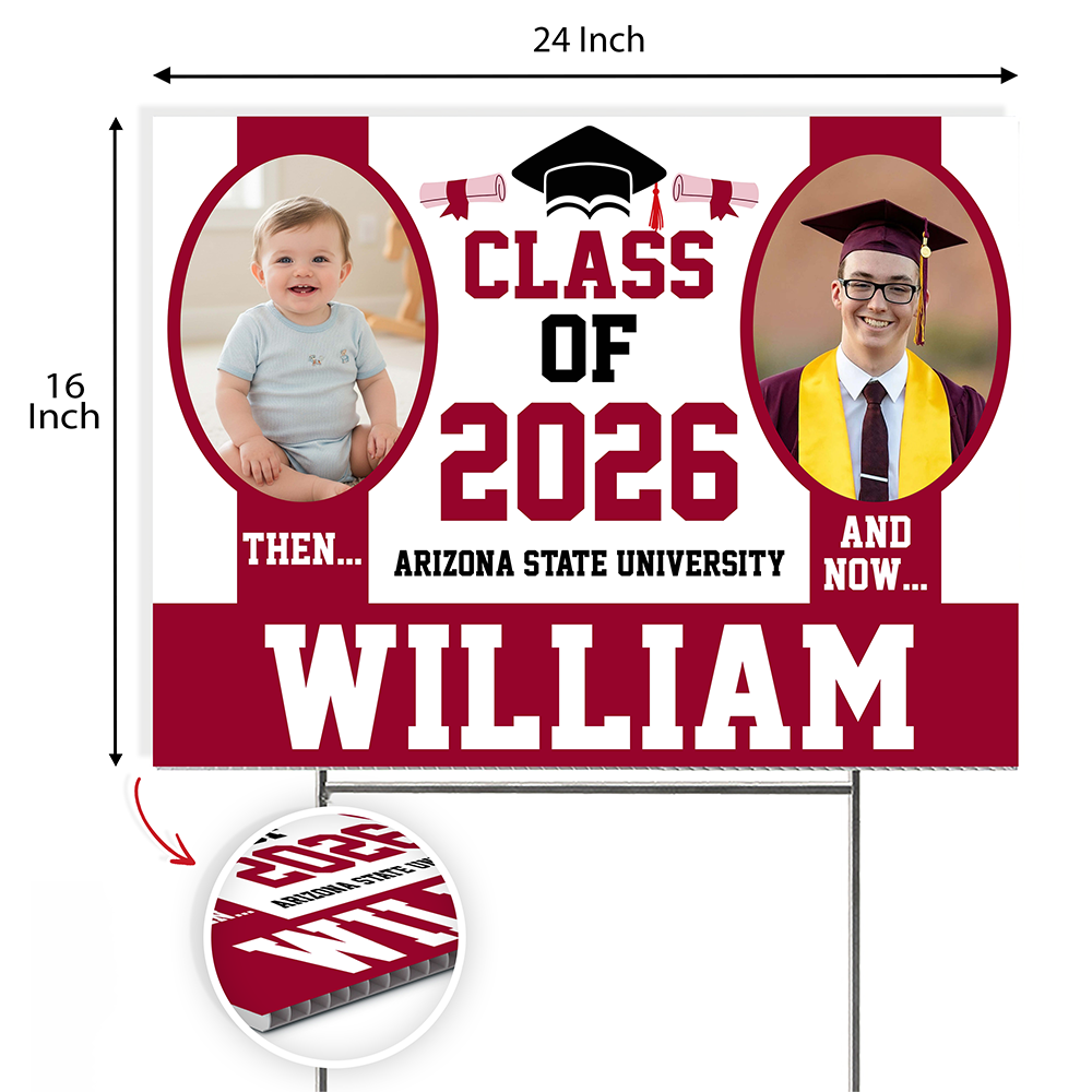 Celebrate your graduate's milestone moment with this striking personalized yard sign. Customized with their name and class year, it's the perfect way to honor their achievement and create lasting memories. Display it proudly in your yard to show your support and let the neighborhood join in the celebration. Made with durable materials built to withstand outdoor conditions, this eye-catching sign serves as a memorable keepsake long after graduation day. A thoughtful gift that captures this special transition into adulthood.