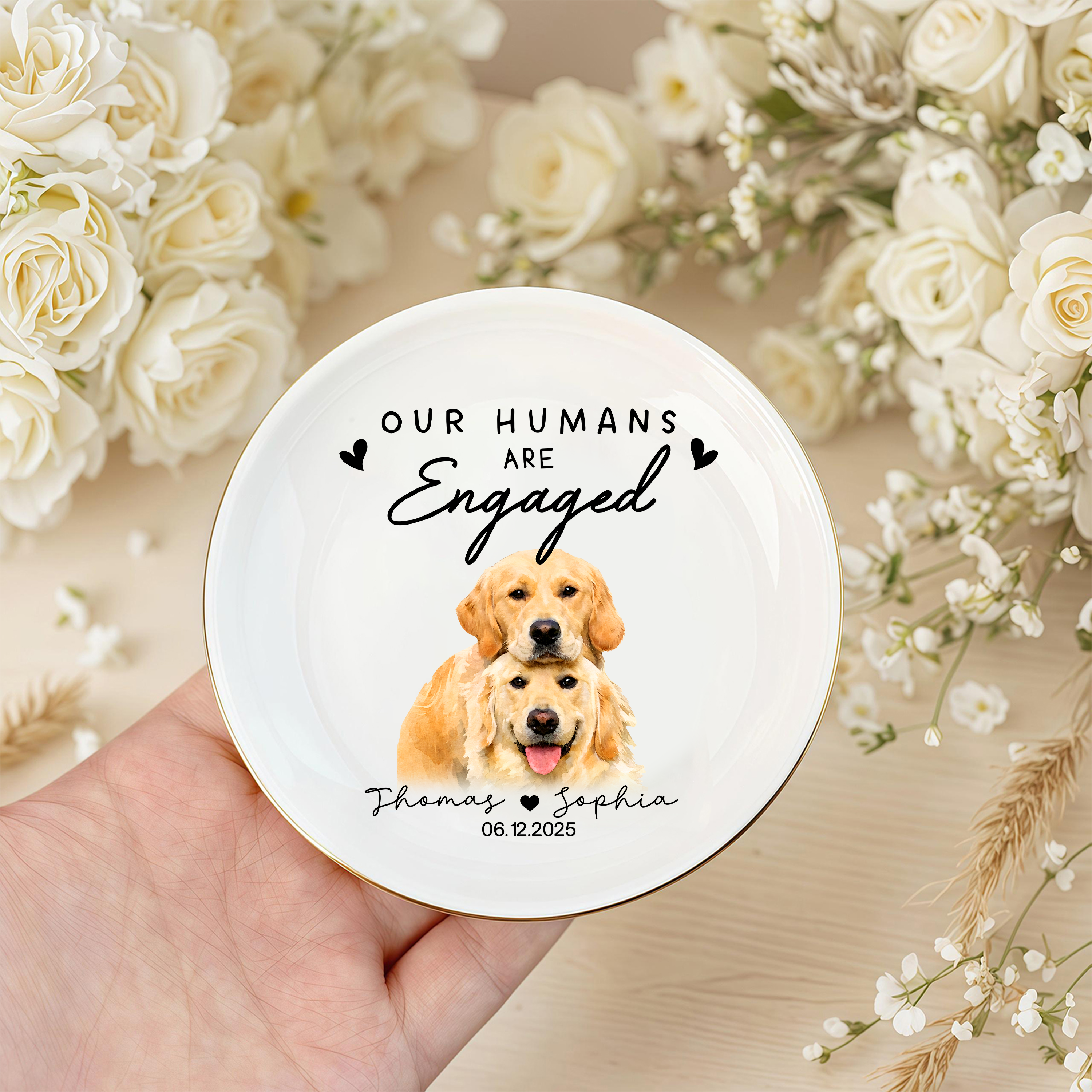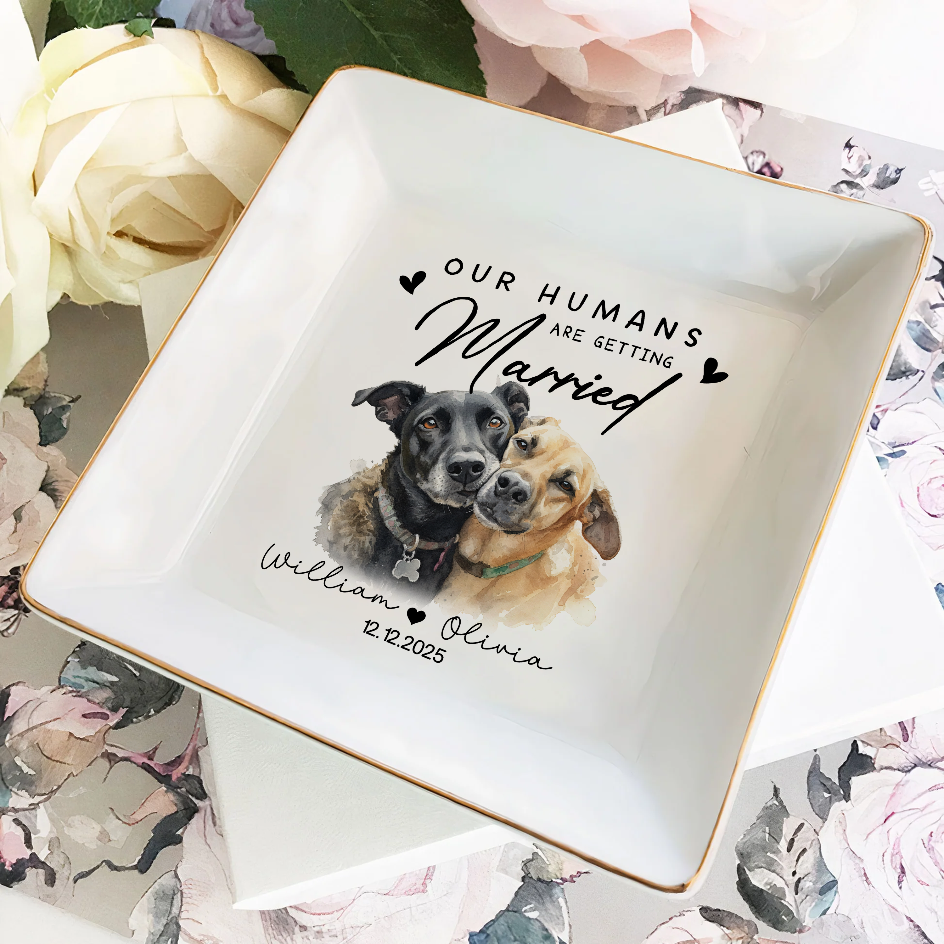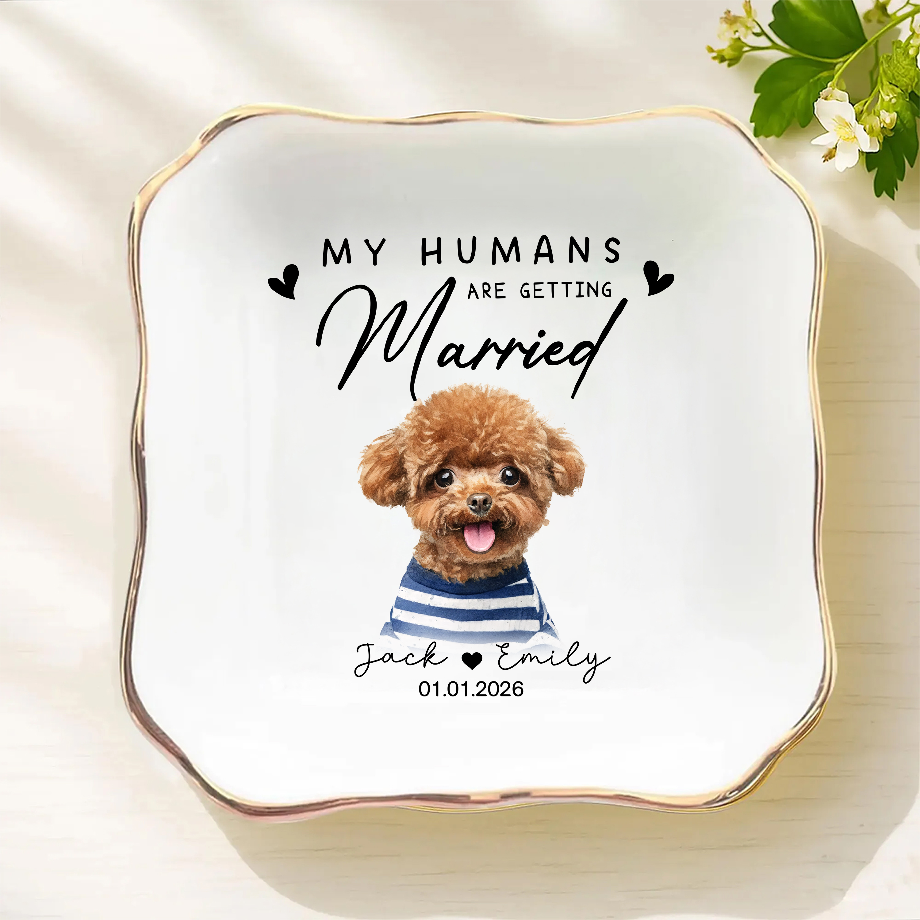 Celebrate your engagement in style with this charming custom photo ring dish, the perfect keepsake for dog-loving couples. Personalize it with your favorite photo to create a one-of-a-kind piece that holds your rings while adding a heartfelt touch to your space. This thoughtful engagement gift combines functionality with sentiment, making it an ideal way to commemorate your special moment together. Whether displayed on a nightstand or dresser, it's a daily reminder of your love story—and your furry best friend's place in it. A unique, meaningful gift that captures what matters most.
