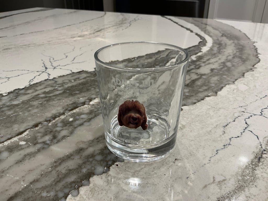 Imbue your drink with the love of your four-legged companion with this personalized rock glass. Made of high-quality glass, this piece is the perfect addition to any dog lover's collection. Indulge in luxury and sophistication while sipping on your favorite beverage.