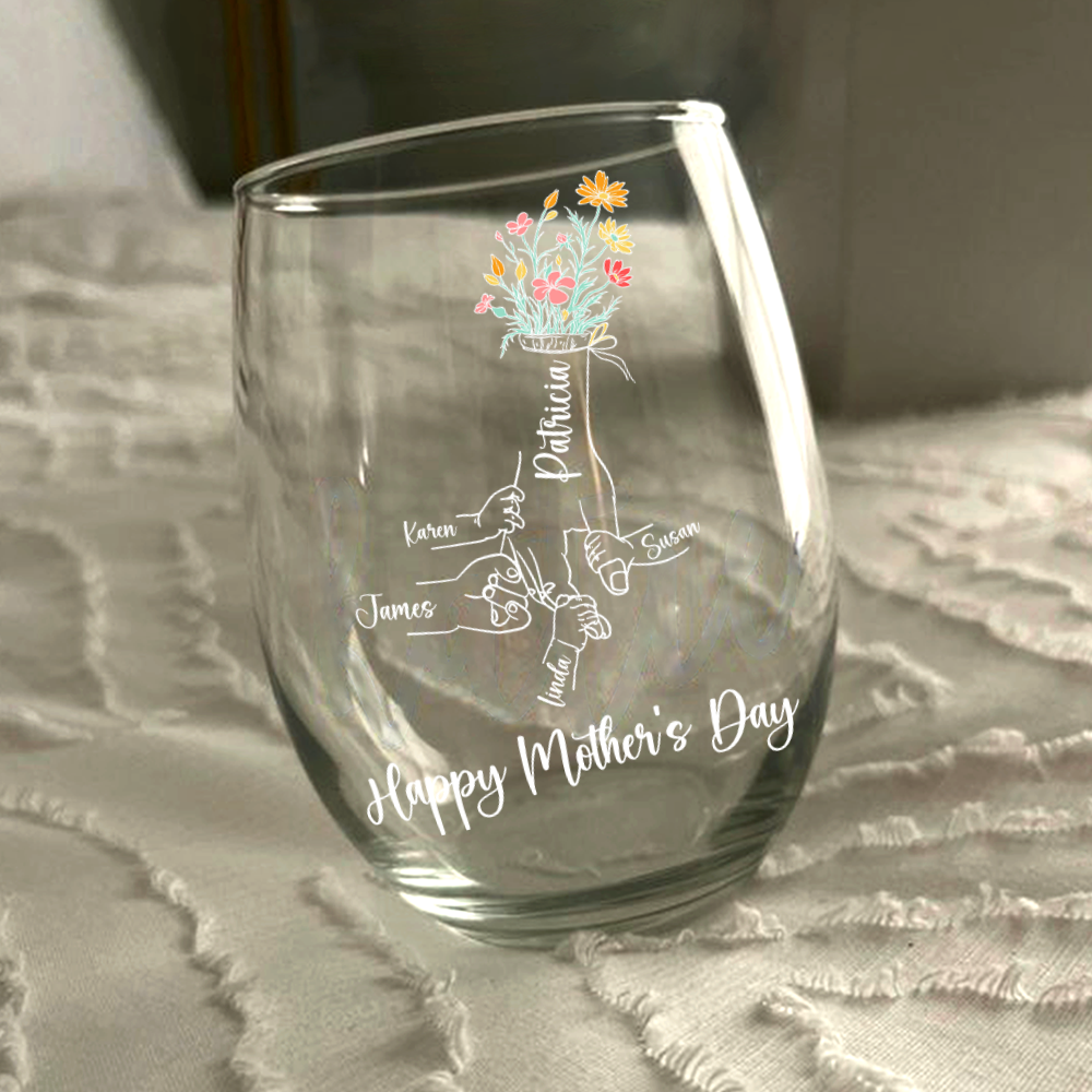 Unleash your mom's love for wine and her children with our Personalized Floral Hands Wine Glass! This elegant and unique wine glass serves as the perfect gift for Mother's Day, creating a heartfelt connection between mother and child. Cheers to a memorable and meaningful celebration!