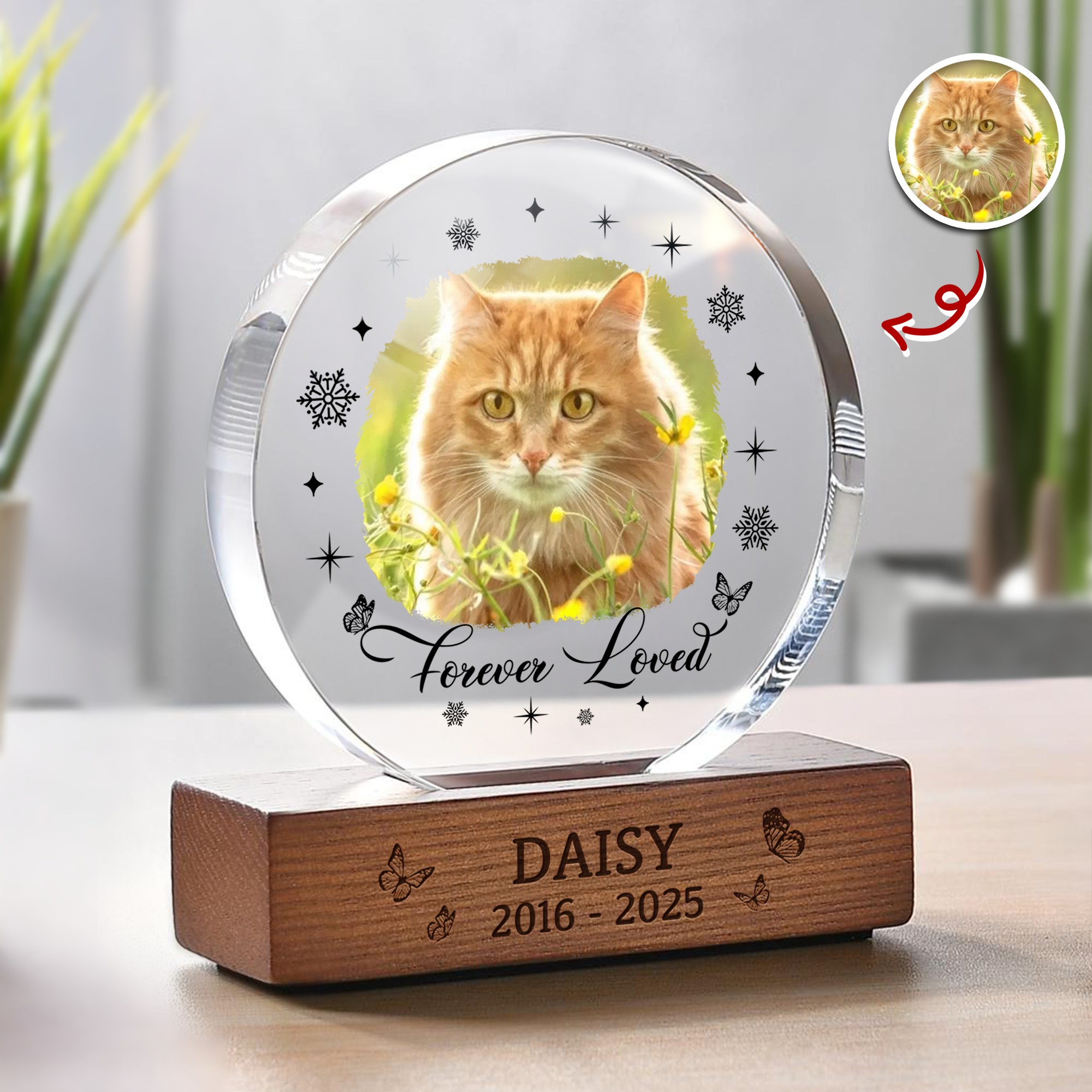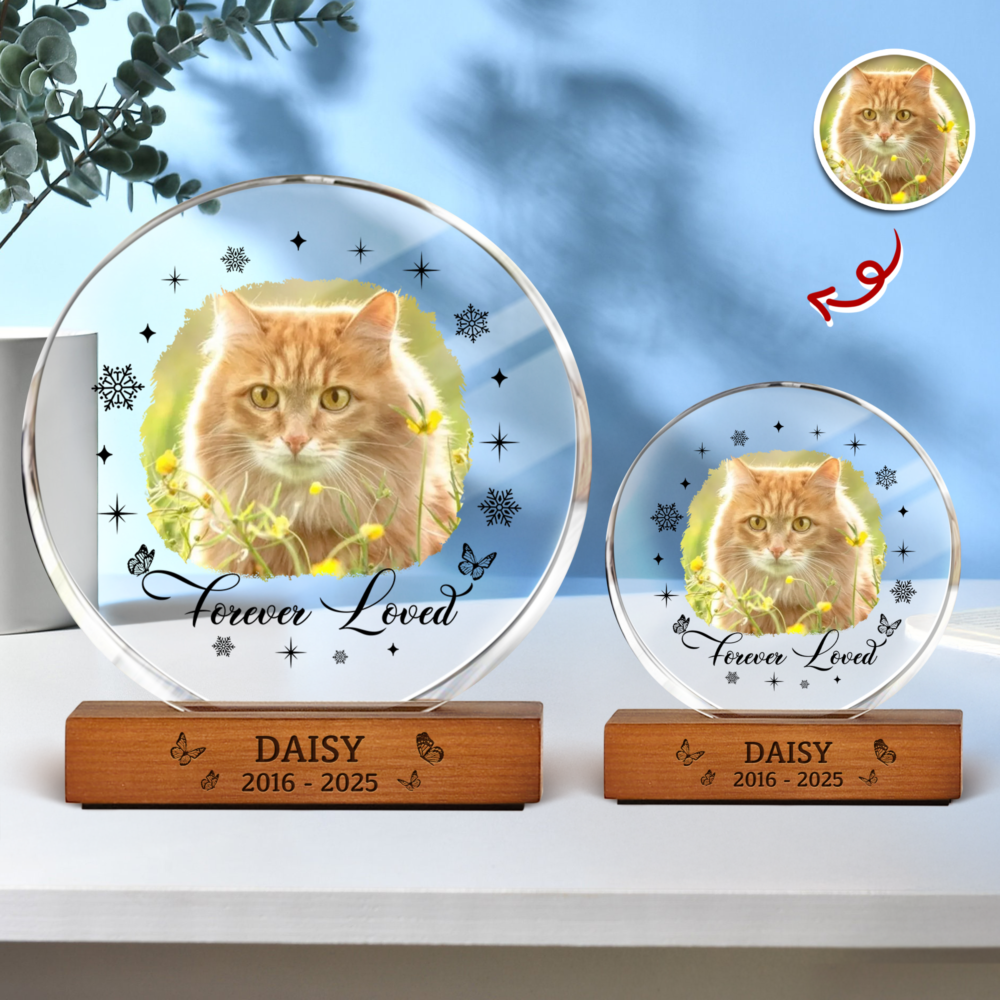 Honor your beloved pet’s memory with this Custom Photo Memorial Dog and Cat Keepsake. Crafted from clear acrylic in a stylish round frame block, it beautifully preserves your pet's photo while offering a lasting tribute. Its durable, polished design makes it a meaningful display piece for any home, keeping your cherished companion close in heart and sight every day.