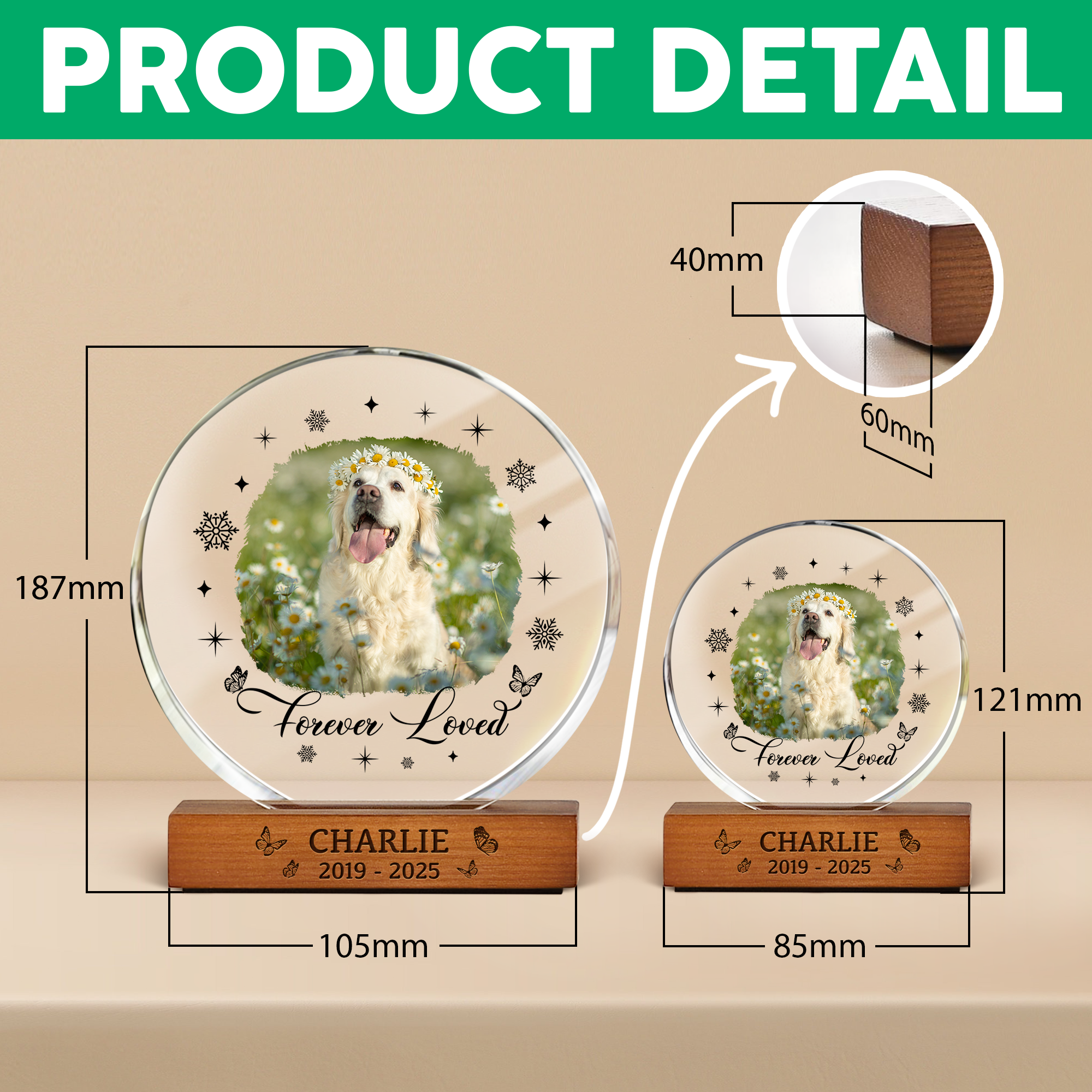 Round clear acrylic frame with engraved wooden base