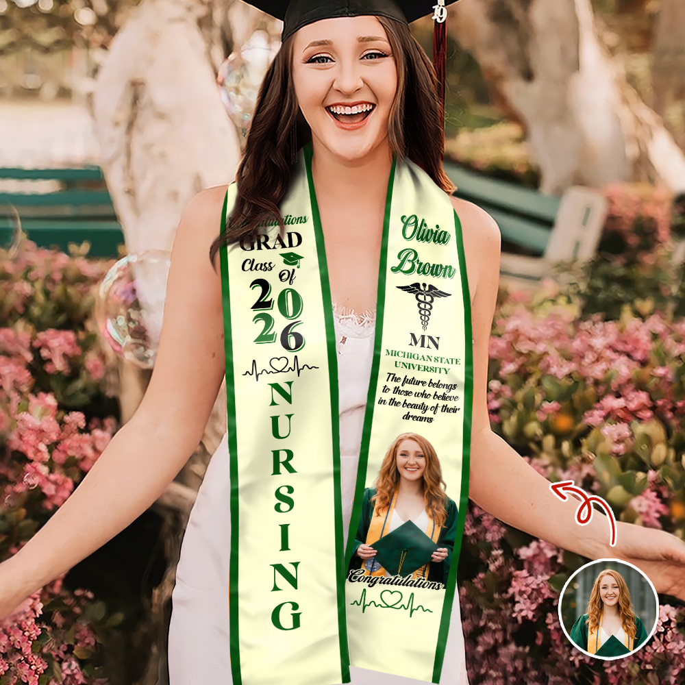 Celebrate your nursing graduate's achievement with this personalized graduation stole featuring their custom photo. This elegant keepsake honors years of dedication and hard work in pursuit of their RN or BSN degree. The high-quality stole drapes beautifully over graduation robes, making it a standout accessory for commencement ceremonies. Perfect for creating lasting memories, this customized gift lets you showcase your pride in their accomplishment. Whether displayed in their new office or cherished at home, this one-of-a-kind stole serves as a meaningful reminder of their 2026 graduation milestone and the beginning of their nursing career.