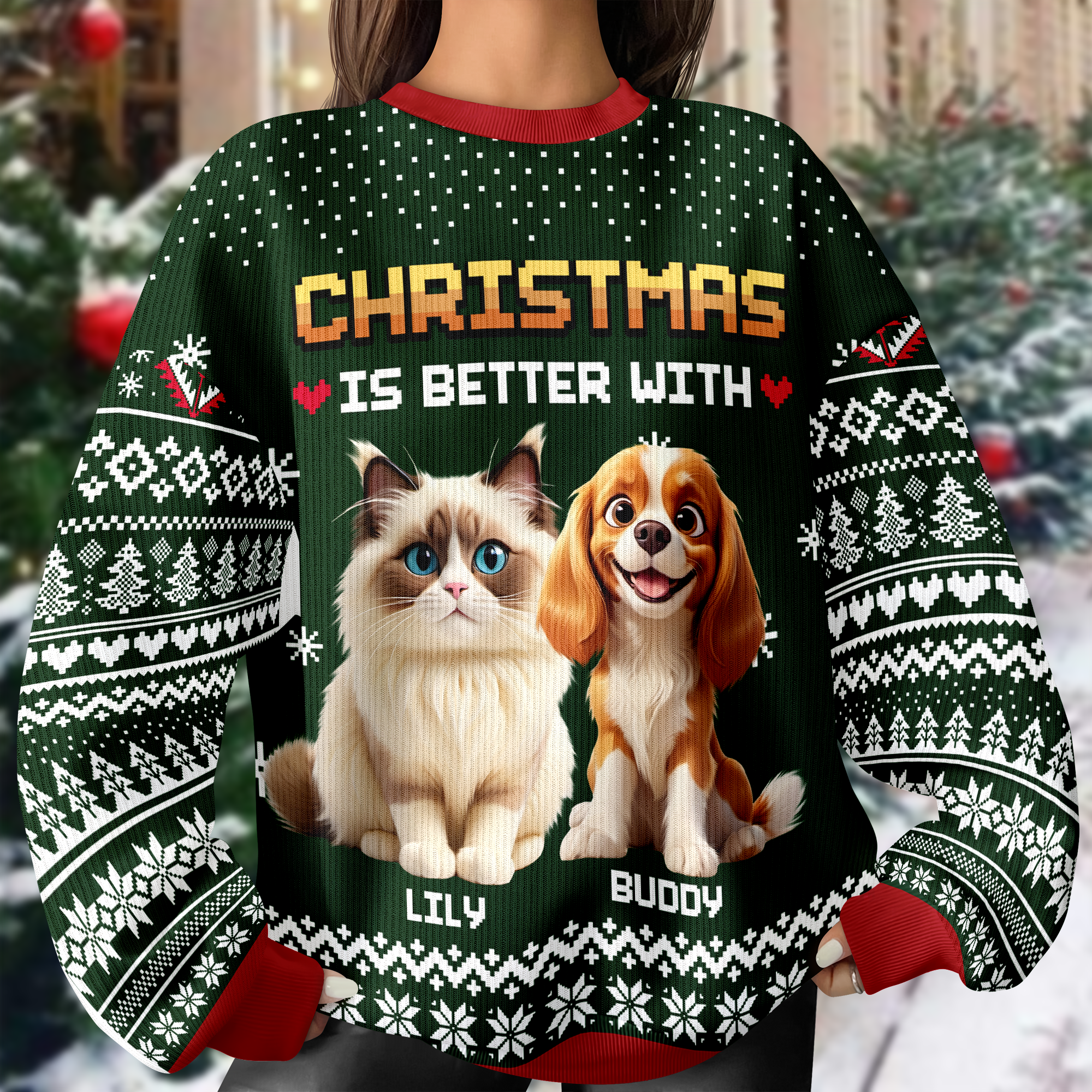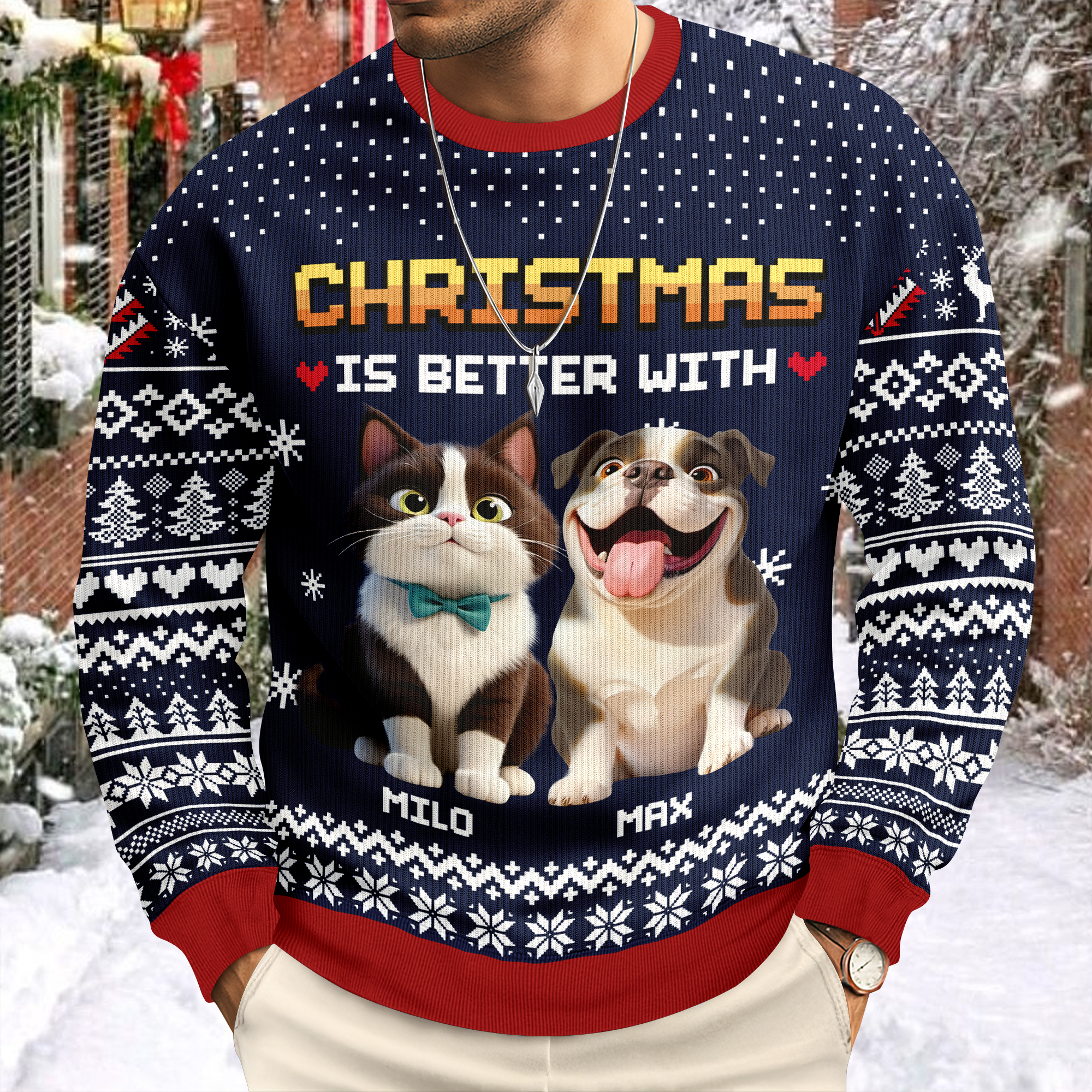 Celebrate the holiday season with cozy style in our Personalized Christmas Better With Dog Cat Ugly Sweater. Perfect for pet lovers, this festive sweater combines charming dog and cat designs with a fun, ugly sweater vibe. Stay warm and show off your love for your furry friends at any holiday gathering. Customize it for a unique touch that makes your celebration even more special.