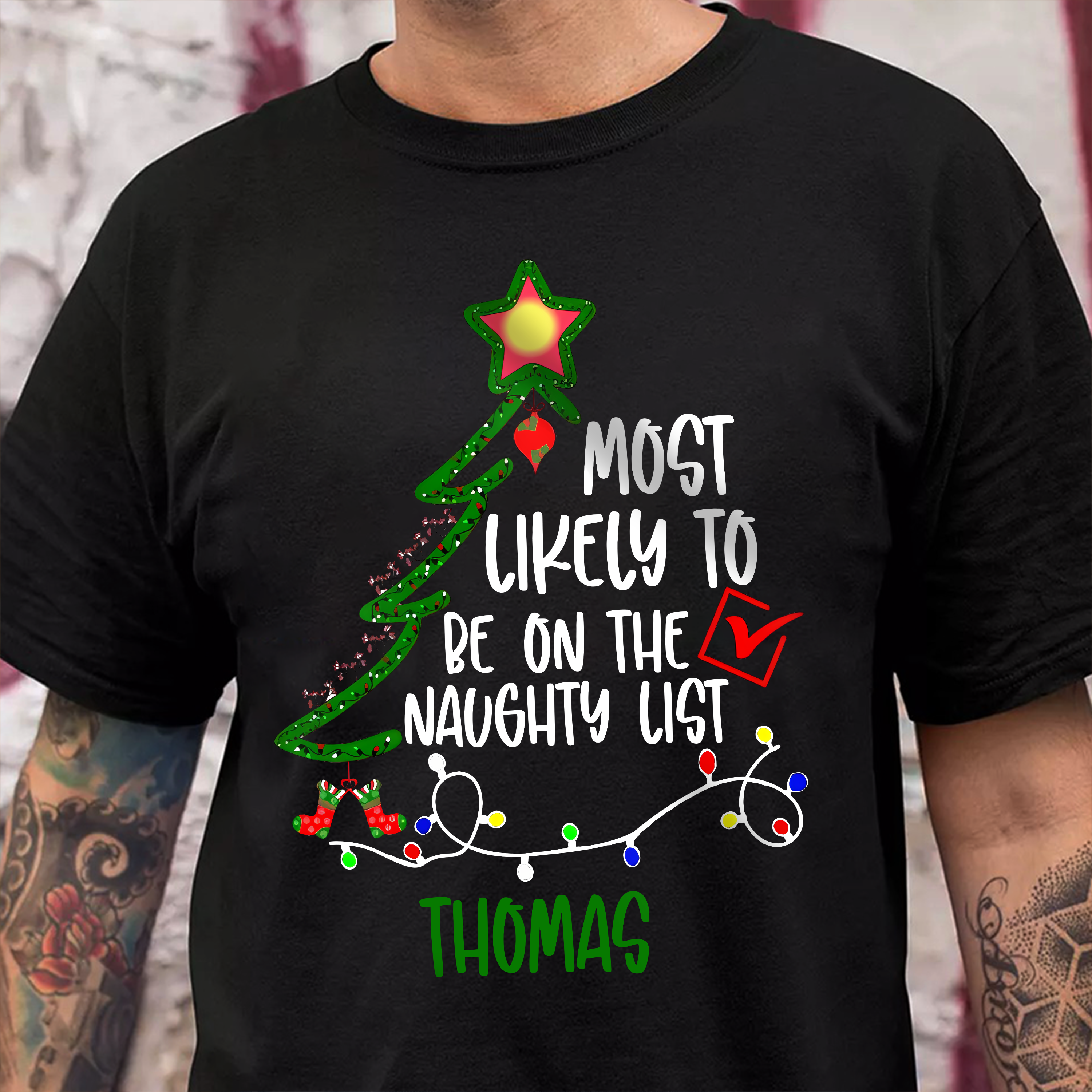 Celebrate the holidays together with this hilarious family Christmas shirt! Perfect for creating unforgettable memories, this custom design features playful "Most Likely To" categories that spark laughter at every gathering. Personalize it with your family's names to make each member feel special and included. Ideal for holiday photos, festive parties, or cozy nights in, this comfortable tee brings everyone closer through humor and togetherness. Make your Christmas truly memorable with a shirt that captures your family's unique personality and inside jokes.