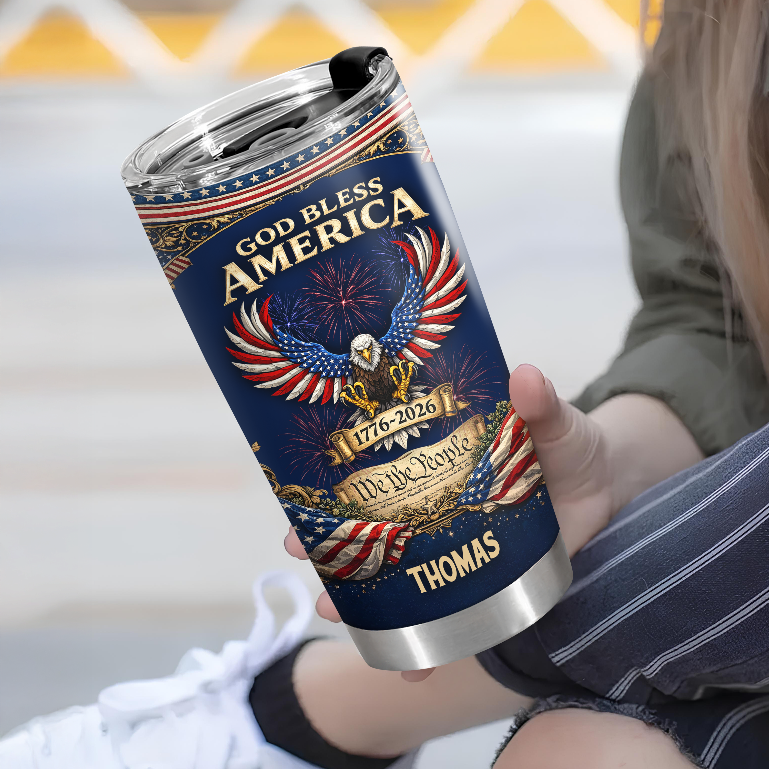 Celebrate 250 years of American heritage with this custom fat tumbler, personalized with your name and patriotic design. Featuring "God Bless America 1776 - 2026," this durable drinkware keeps beverages at the perfect temperature while making a bold statement. The generous capacity and ergonomic design make it ideal for daily use at home, the office, or on the go. A meaningful gift for history enthusiasts and proud Americans alike, this tumbler combines functionality with timeless patriotic pride.