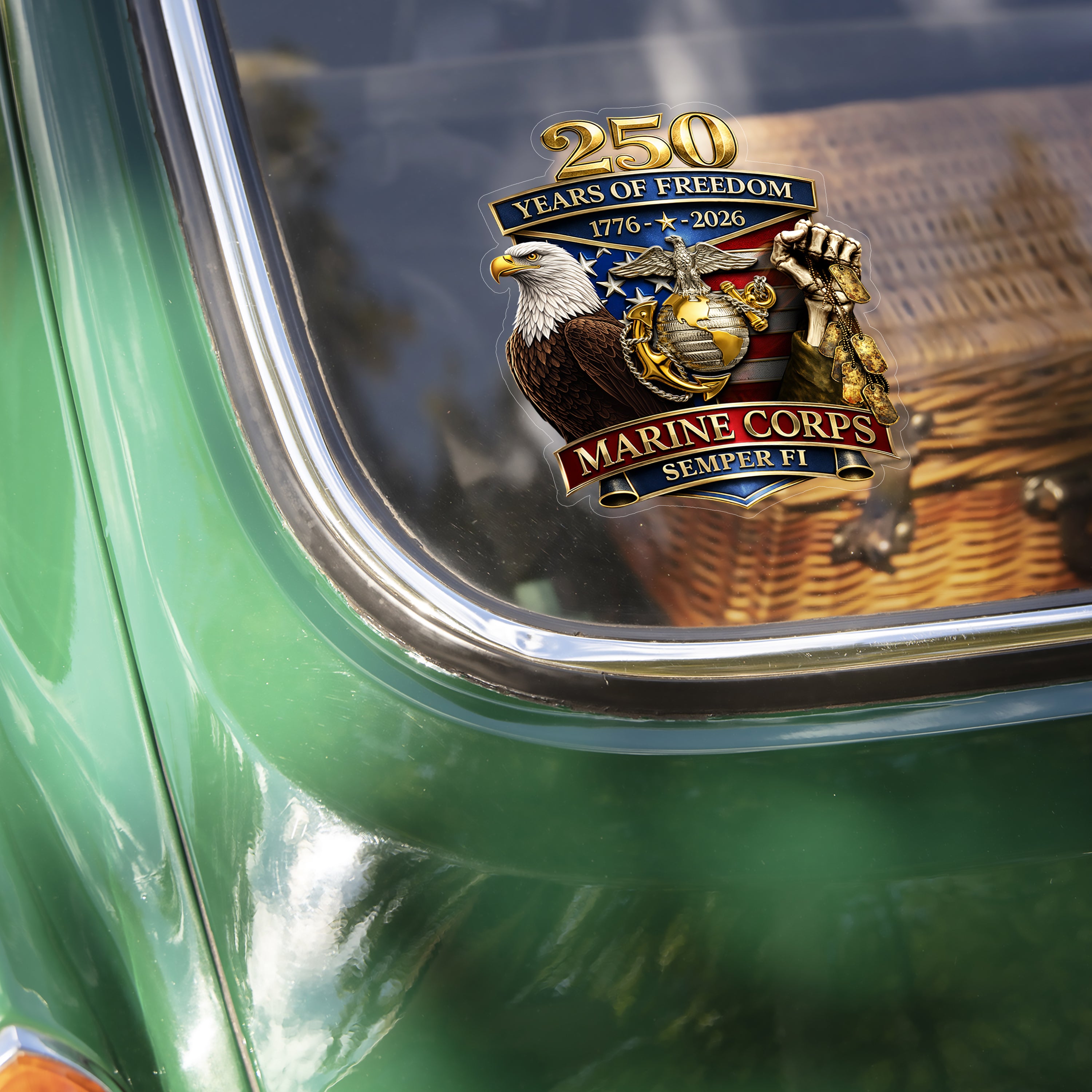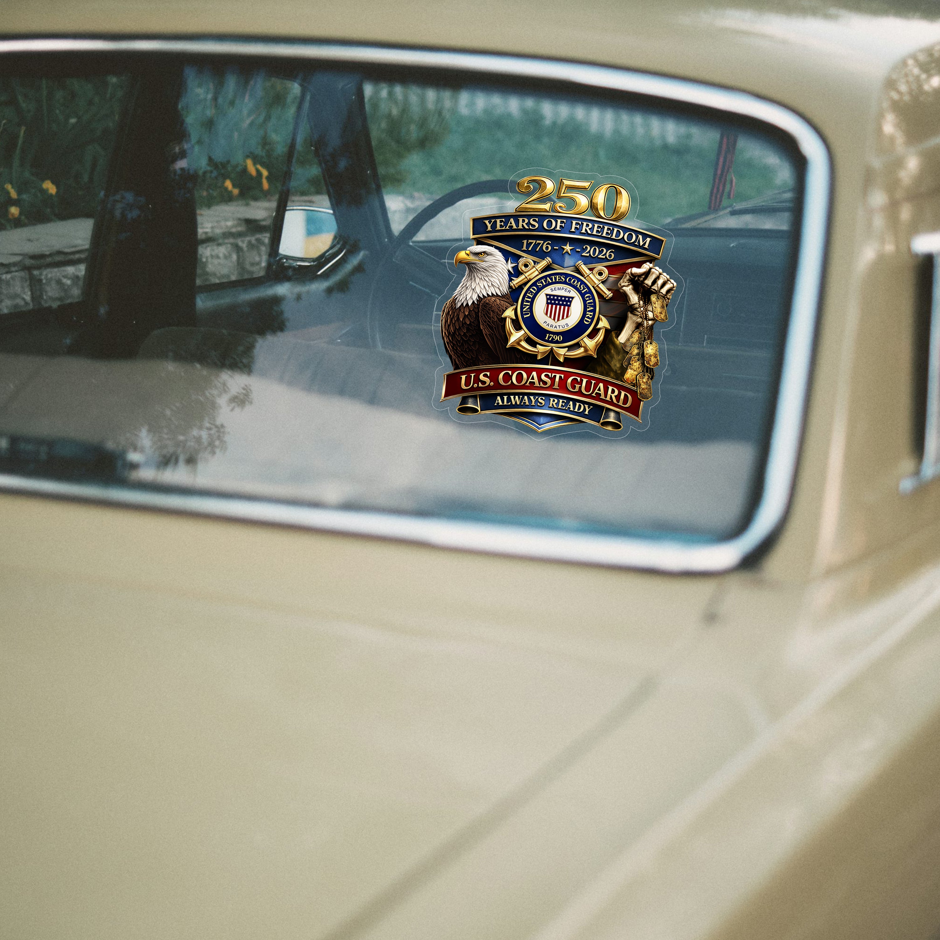 Perfect for honoring military service and American pride, this personalized car window decal celebrates 250 years of freedom with a bold design featuring your chosen military branch. Crafted from premium vinyl with waterproof, fade-resistant adhesive, it applies easily to windows and doors without leaving residue. Durable enough to withstand years of outdoor exposure, it's an ideal gift for veterans, active-duty personnel, and patriotic supporters. Display your respect and gratitude with style.