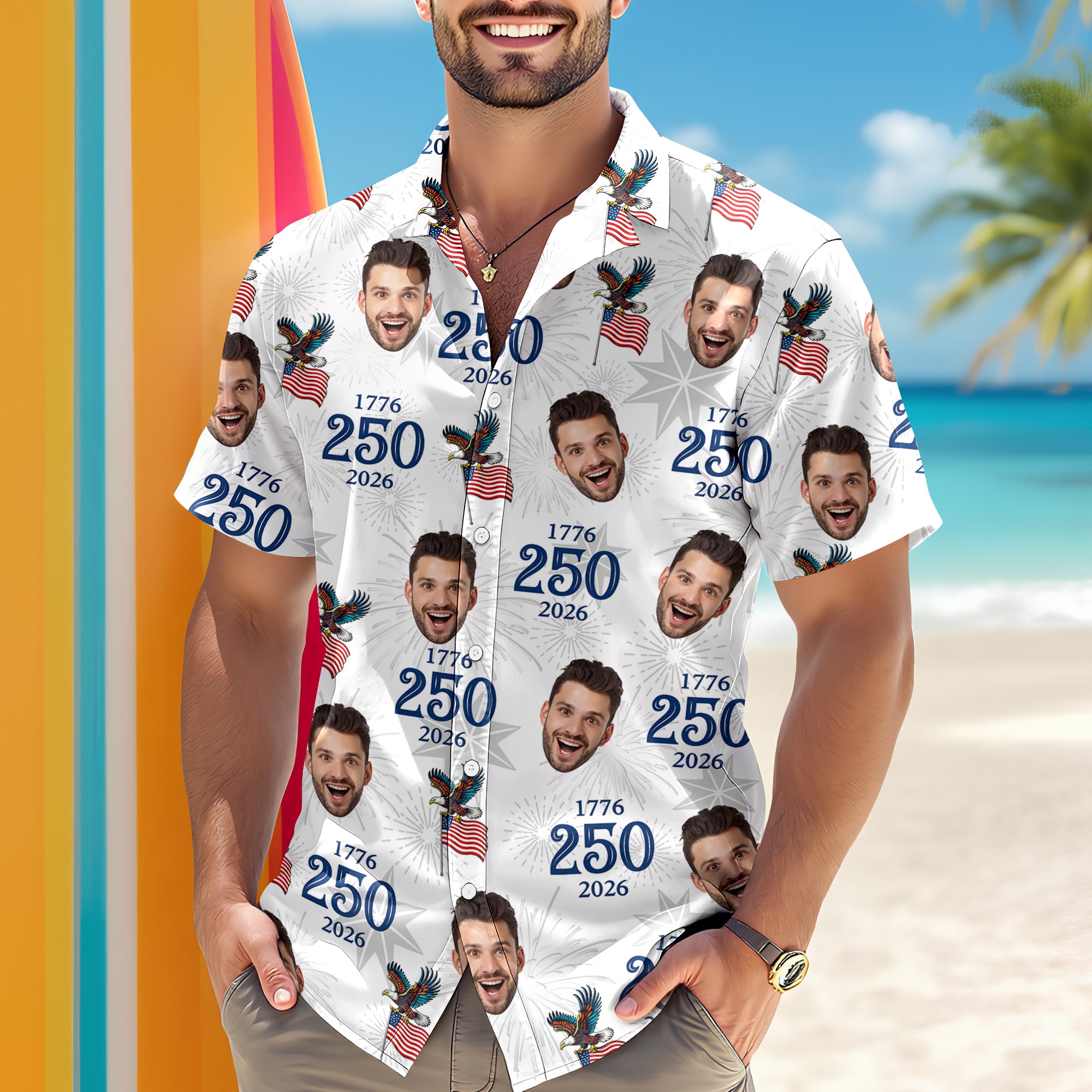 Celebrate America’s 250th anniversary in style with this custom photo 1776–2026 Hawaiian shirt. Personalize it with your favorite photo to create a unique and eye-catching patriotic design. Perfect for vacations, summer outings, and national celebrations, this shirt blends tropical vibes with pride for this historic milestone.
