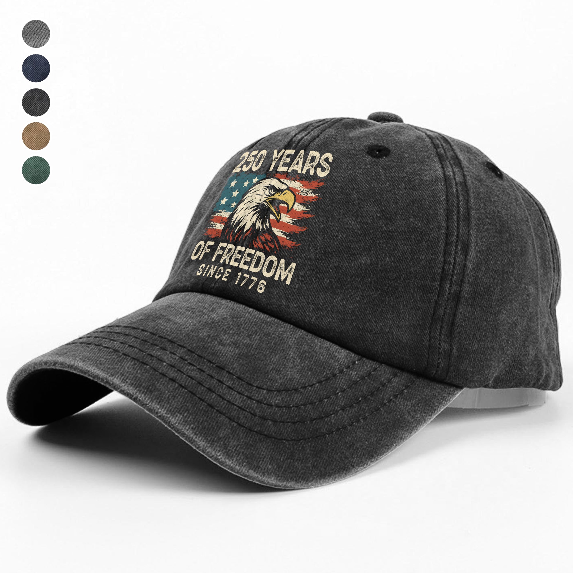 Celebrate America's 250th anniversary with this stylish Washed Denim Baseball Cap. Designed for comfort and durability, it features a classic look that honors this historic milestone. Perfect for everyday wear, show your patriotic pride while enjoying a timeless accessory made to last.