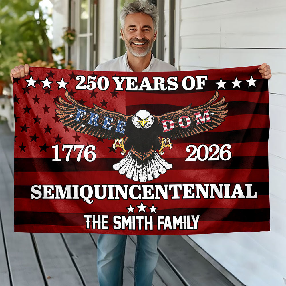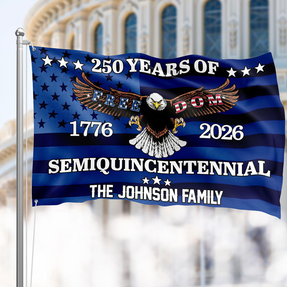 Personalize your patriotic display with this custom semiquincentennial house flag celebrating 250 years of American freedom. Add your family name to create a unique tribute that honors both heritage and national pride. Durable construction ensures vibrant colors through every season.