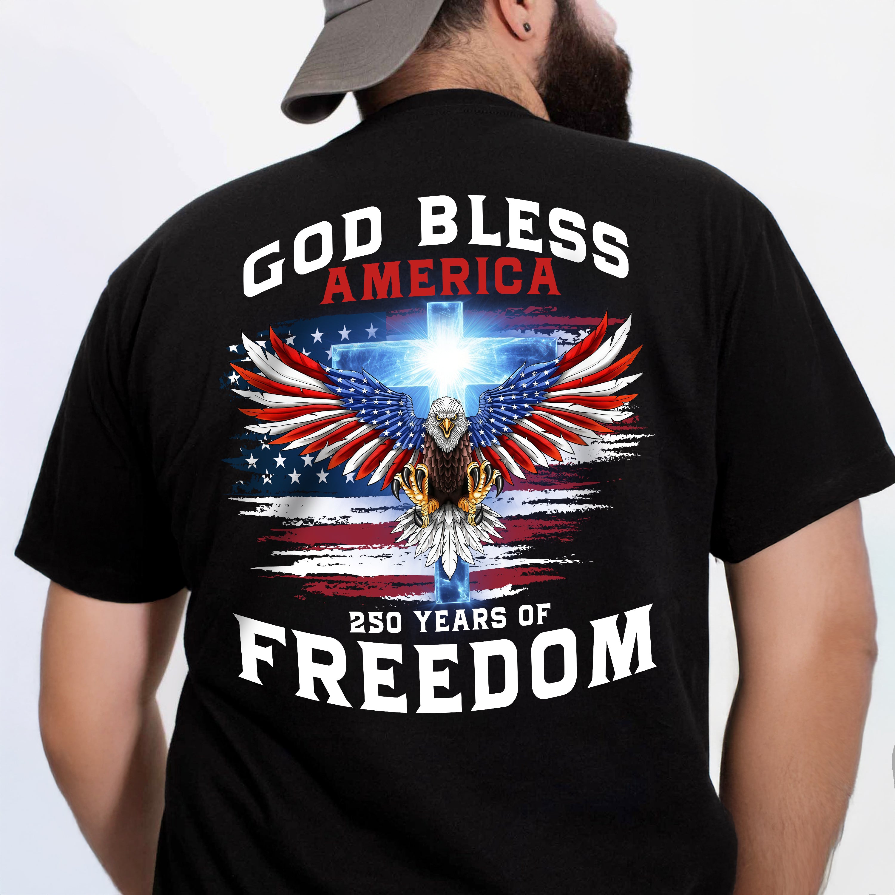 Celebrate America's rich heritage with this striking patriotic shirt featuring a bold eagle design symbolizing freedom and national pride. Perfect for commemorating 250 years of blessings, this tee combines timeless patriotic imagery with modern comfort. The "God Bless America" message resonates with those who cherish their country's values and history. Ideal for Independence Day gatherings, patriotic events, or everyday wear that showcases your love for the nation. Crafted for quality and durability, this shirt makes a powerful statement while keeping you comfortable. Whether you're attending a celebration or simply expressing your patriotic spirit, this personalized design delivers both style and meaning in one exceptional garment.