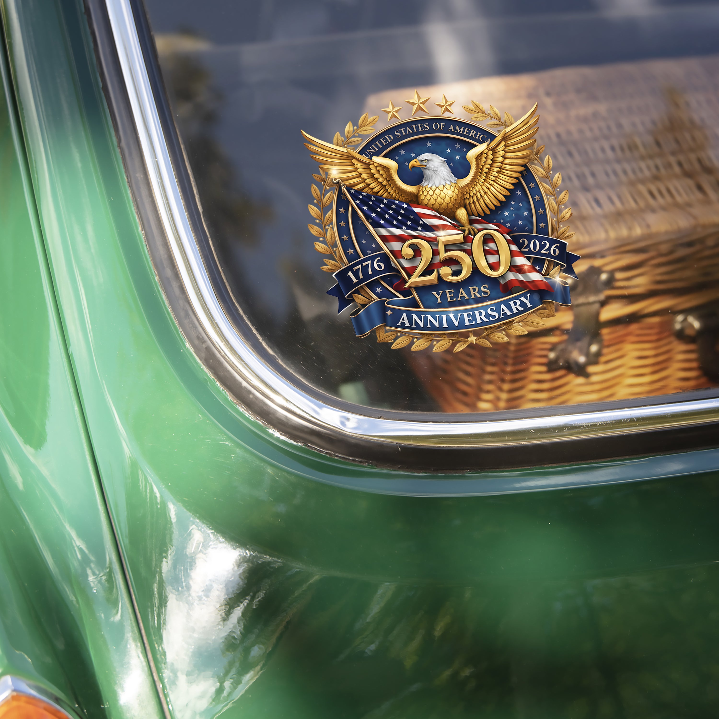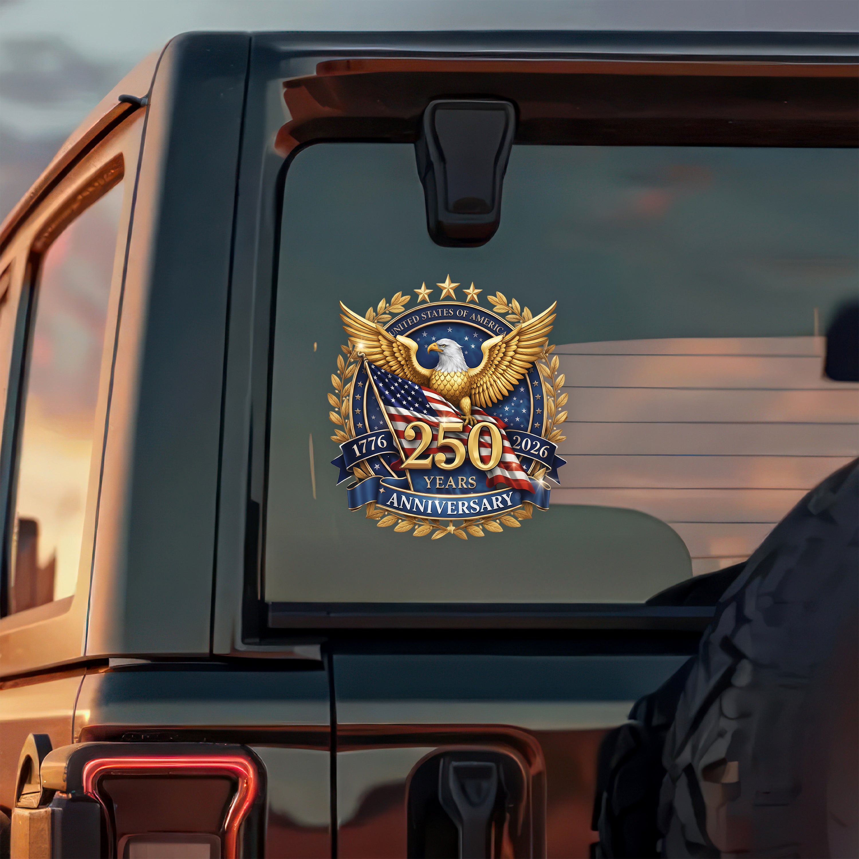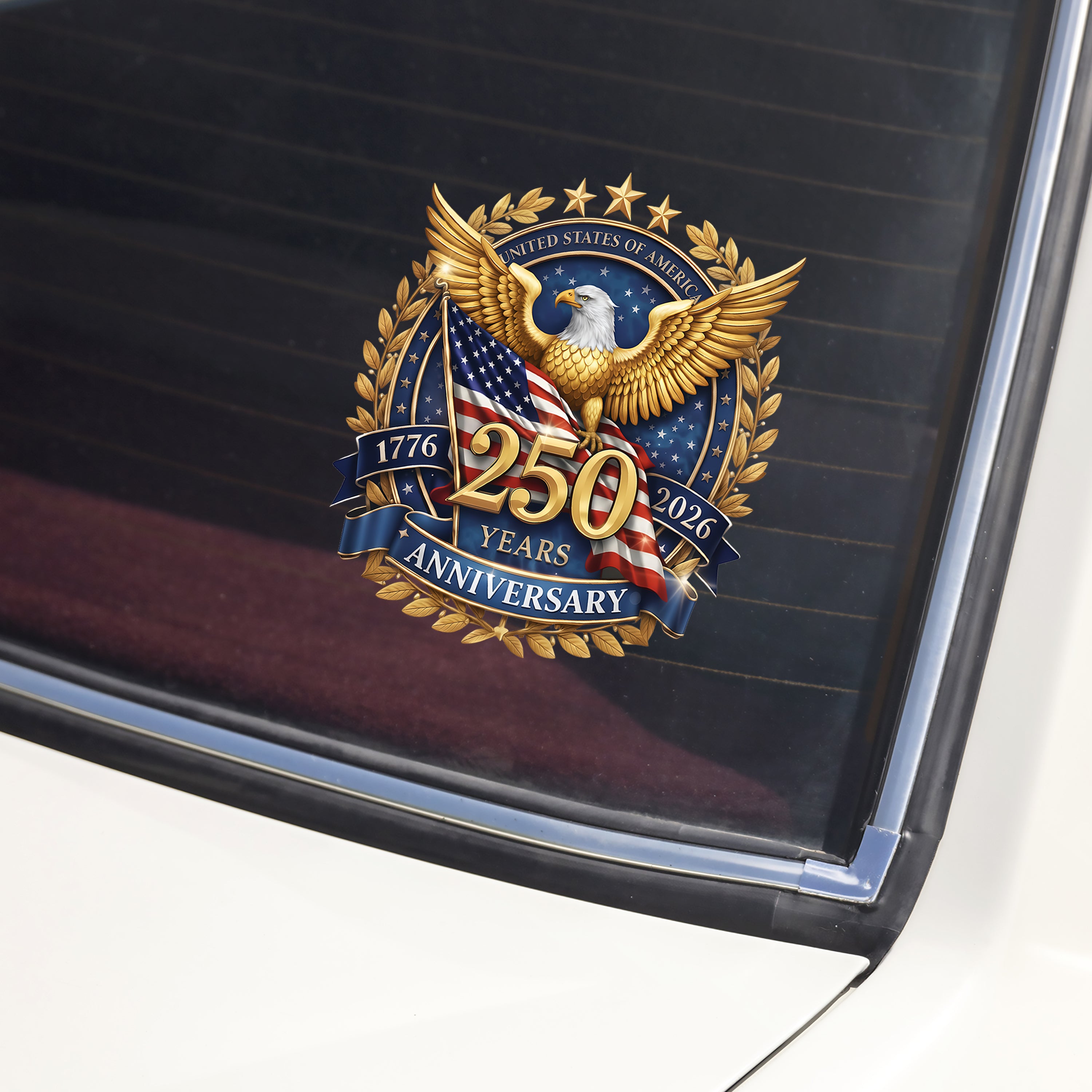 Celebrate America's milestone with this striking 250th Anniversary Emblem featuring patriotic eagles and flag design. Perfect for car windows, this high-quality decal sticker lets you display your national pride wherever you go. Whether you're a history enthusiast, patriotic collector, or searching for a meaningful gift, this eye-catching sticker makes an ideal choice. Durable and weather-resistant, it's built to last through seasons of outdoor display. Honor the nation's legacy with style—a must-have for anyone who cherishes American heritage and wants to showcase their patriotic spirit.
