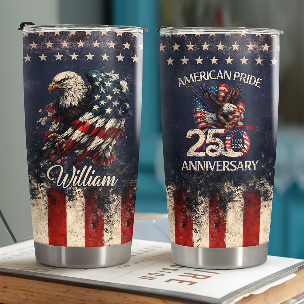 Celebrate America’s 250th anniversary with this custom name eagle fat tumbler, honoring the 1776–2026 milestone. Personalize it with a name to create a bold and meaningful patriotic design. Made from durable, high-quality materials, it’s perfect for keeping your drinks hot or cold on the go. A great gift for anyone who wants to show off their American pride in a stylish and practical way.