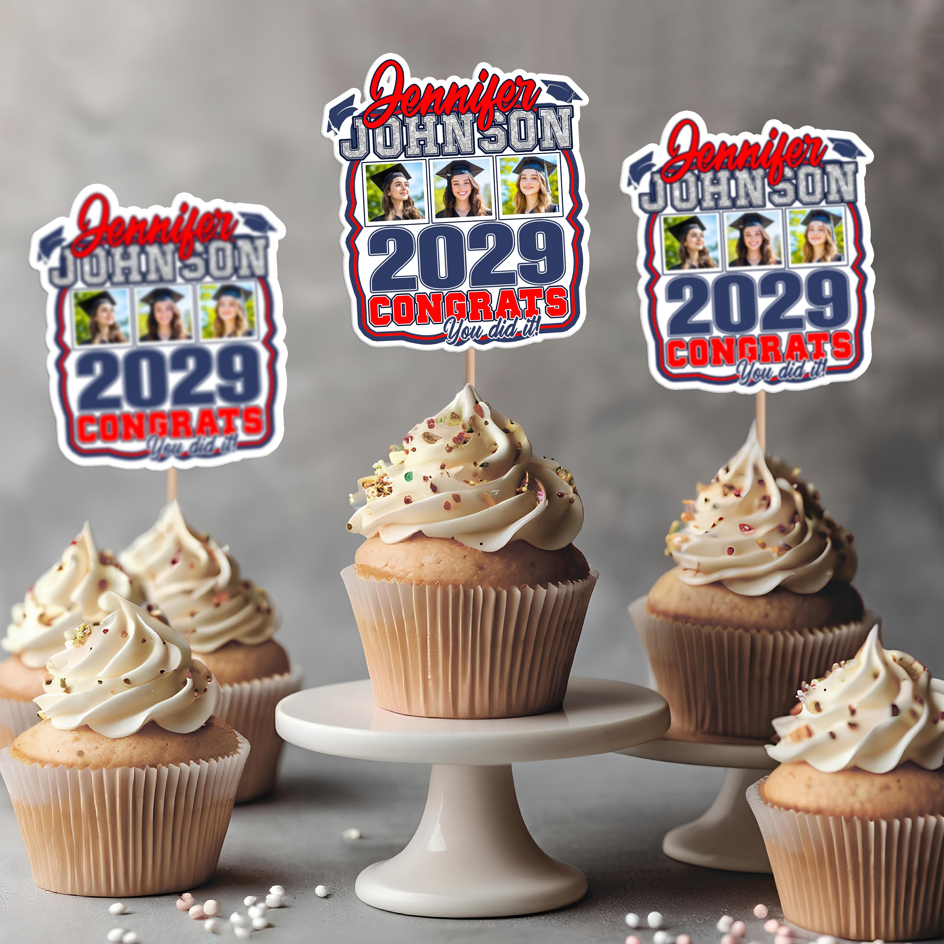 Celebrate the milestone with customized cupcake toppers! These Senior Night themed cupcake toppers make the perfect gift for Graduation. Personalize with your own photos and add a special touch to the celebration. Say "congrats" in a unique and memorable way with this one-of-a-kind favor!