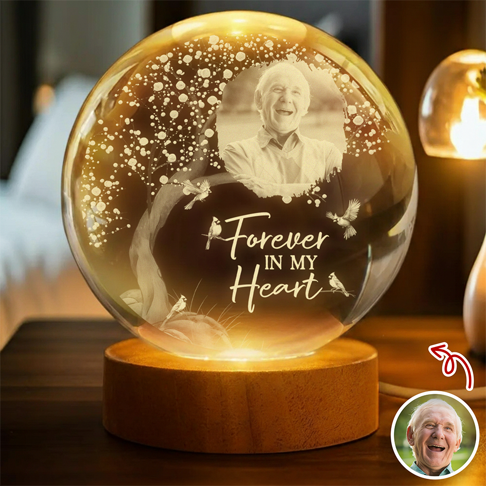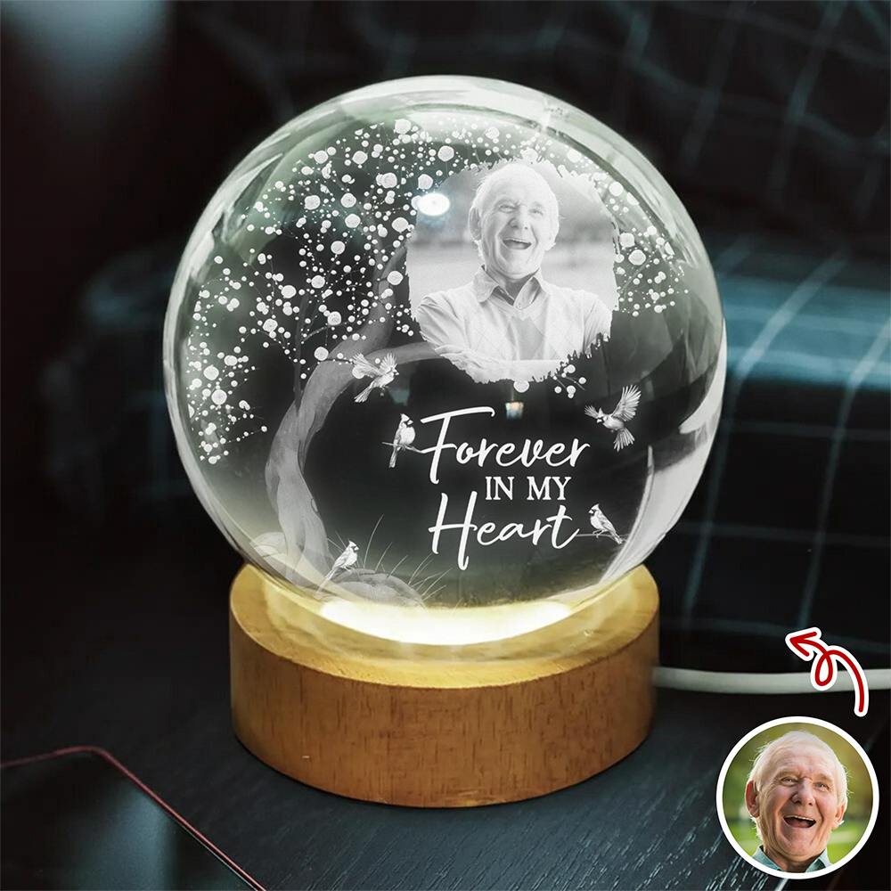 Transform cherished memories into an elegant keepsake with this custom photo engraved crystal ball LED night light. Perfect for honoring loved ones, this personalized memorial gift combines timeless beauty with modern technology. The crystal sphere features your chosen photo intricately engraved within, illuminated by soft LED light that creates a warm, comforting glow. Ideal for bedside tables, shelves, or memorial spaces, it serves as a touching tribute that celebrates special moments and keeps memories close. A meaningful gift for anniversaries, memorials, or any occasion calling for heartfelt remembrance.