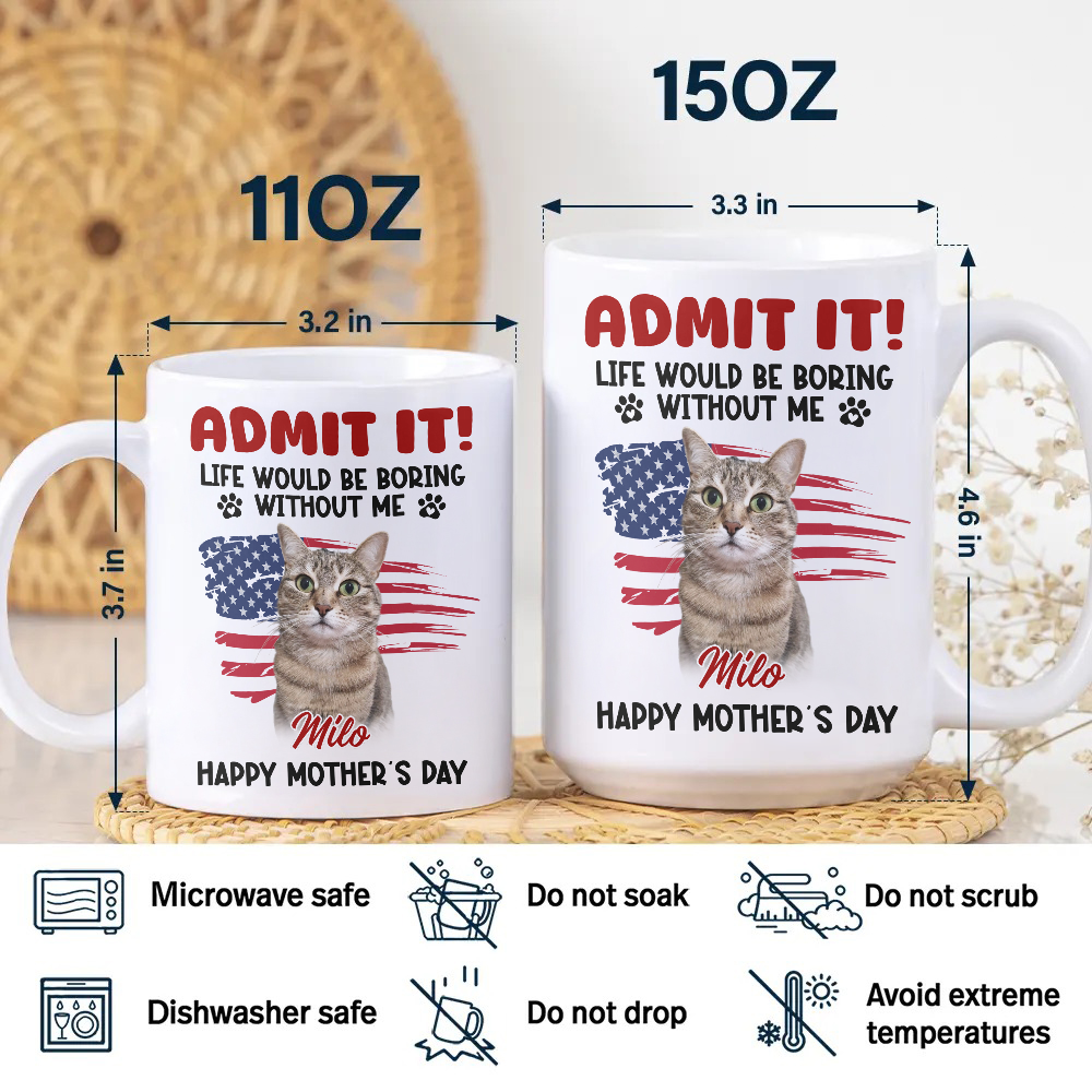 Celebrate your love for pets with this Custom Photo Life Would Be Boring Without Me white mug, perfect for dog and cat lovers. Featuring a personalized photo option, it brings a unique touch to your daily coffee or tea ritual. Made from durable ceramic, this mug combines practicality with heartfelt charm, making it an ideal gift or a delightful addition to your own collection. Brighten your mornings and showcase your pet passion with every sip.